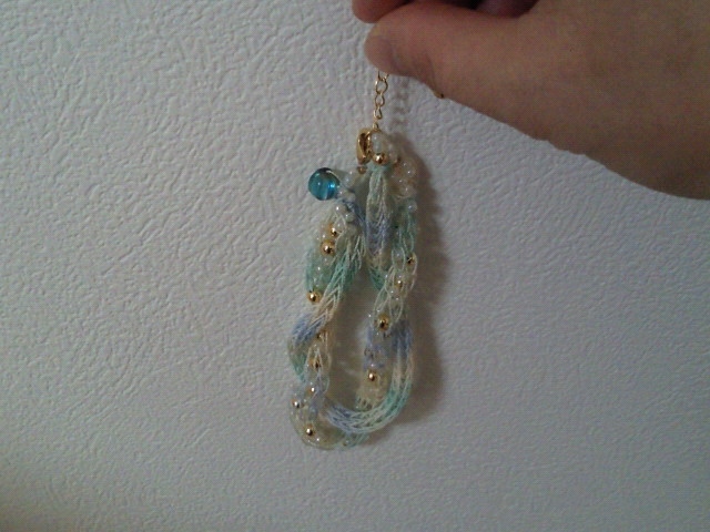まずはビーズステッチ糸で携帯ストラップを作りました。図書館で借りてきた本を参考に、アレンジして作ってみました。う~ん、糸に通していくだけなのですがすぐに緩んでしまったりして意外と大変でした(^_^;)結構可愛くできたかな?と思うのですが、強度が心配です。今度、久しぶりに会う友達に手作りの携帯ストラップをプレゼントしたいのですが、もっとデザイン工夫して完成度もあげないといけないなと感じました。間に合うかな(^_^;)次は、レース糸でブレスレット。これは、チューブクロッシェの練習用。練習用なので、手持ちの安い丸大ビーズを使いました(笑)最初、手順を間違えて全然チューブ状にならず何回かやり直しの末、ようやく間違えに気付き、進めていきました。あとは、同じ事の繰り返しで思ったよりスイスイと編んでいけました。でも、最後に大きなビーズを通して輪にして止める際に、糸が緩んで大きいビーズの間に隙間が出来てしまいました(^_^;)どうやら私は最後の糸始末が苦手らしいです。大事なとこなのに~(T_T)デザインは、編む前にビーズを何個か並べてこれでいいかと思ったのですが、チューブ状にしてみると想像よりも派手になってしまいました(^_^;)ビーズを全部通す前に、いくつか通して実際に編んでみて確かめれば良かったな。ステッチ糸と針の手法よりもこちらの手法の方が、自分には向いているのかも。でも、色々な手法をマスターしたいとも思います。楽しいし(^^)