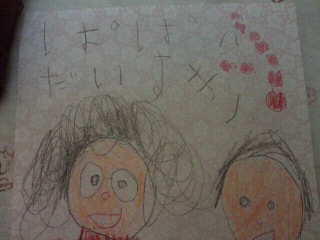 娘が昨日、パパに書いた手紙です。だいぶひらがなも上手に書けるようになりました(まだ反対になったり、書き順違ってたりしますが)。旦那は、すごく感動していました。私も娘の成長を感じ、感動(^^)ちなみに向かって左側がパパだそうです。キテレツ大百科のコロスケみたいと思ったのは私だけでしょうか・・・(笑)