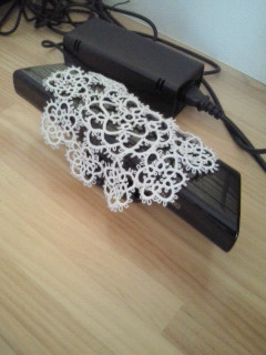 『タティングレース~新しい世界~』という本に載っていた『湖の華』という作品を作ってみました。 この本に載っている作品はどれも素敵だし、それを引き立てるような小物類も本当に素敵。 そして、作品名も素敵。 この本を買ってしばらくは、ただただ作品をうっとり眺めていました(*^_^*) 私が作ってみたのは、『湖の華』の中で一番易しいアレンジのものです。 手持ちの#20の糸で作りました。 ゆっくり、ゆっくり、一日モチーフ一個くらいのペースで進めていて、ようやく完成しました。 中心部分が歪んでしまったり、モチーフ繋ぎの方法がよく分からなかったりですが、とりあえず完成出来たので、まあいいかー^ロ^; 完成したドイリーですが、使い途を考えてなかったので、 今はとりあえずキネクトの上にかけています(;^_^A