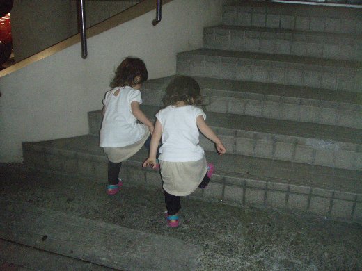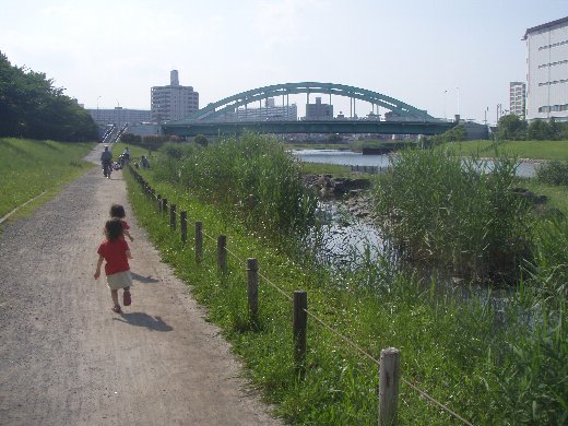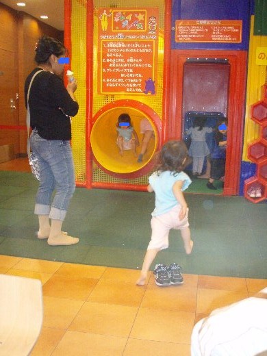 今日もいい天気!二人に聞いたら公園に行きたい!とのことで昨日の夕飯を今日にスライドさせたから料理も子供の分だけだしとお昼を食べてすぐに出発して、亀戸中央公園に行ってみました。(そうそう、朝のうちに粘土にシュタイナーの絵の具で色付けもしたんでした。とっても綺麗な色に染まって、面白かったです。)行ってすぐの場所にはうっそうとした場所に、木の遊具が少しだけあったものの、ほとんど遊具のない、ただっぴろい公園で、うーんすぐに飽きちゃうかな?と思いつつのんびりお散歩。遊具はすぐに飽きて、歩くうち、お兄ちゃんやお姉ちゃんが何かを拾っているのを発見。何かあるみたい!行ってみる!と2人が行ったのでついていくと、杏の木がたくさん生えている広場で杏がぽとぽと落ちてきていました。2人は大喜びで杏をたくさん拾い袋に入れてまわってとっても楽しそう(^^私も、遊具とかではなくて、自然をそのまま楽しむ二人に、とても和やかな気持ちになりました♪目いっぱい拾って(これって何かに使えますかねえ?)更に進むと旧中川の川沿いにでました。ここもまたお兄ちゃん達が何かをやっているので見に行くと川に一部囲いがしてあって、石がひかれて、そちらにいけるようになっていて、みなでサカナを取っているところでした。うちの子たちも興味津々!やってみたい!!と言ったものの、網がなかったので、網を買ってきっとまた来よう!と約束し、しばし見学して楽しみました。その後公園を楽しく歩いていくと、2人の大好きな木の遊歩道があり2人は歩く!と大喜び。ちょうど石段と遊歩道を組み合わせて一周150メートルくらいのちょっとアップダウンのあるお散歩道になっていたのですが、一週まわっておしまいと思いきや、もう一回!もう一回!とあっという間に三周。4周目に、一緒に回らないで写真を撮っていたらそれに気づいたりんごが激怒!何でママ一緒にいないの!!と号泣に(^^;抱っこして平謝りで謝って一周歩いてあげたらやっと機嫌を取り戻しそこからなんと6周ほど、計10週くらいまわらさせられました(^^;これだけで1500メートル(笑)炎天下でつらかった~。一体この子達の体力はどのくらいあるのやら。。。やっとタオルと水が欲しい!とベビーカーに戻ってくれて、これから楽しい所に行くんだよ!!と誘って公園をゆったり歩いてやっと公園はおしまい!寝てしまいそうな二人を一生懸命起こしつつ、必死で歩いて駅の近くのサンストリートへ。いつもの滑り台にいくと、2人は眠気もパッチリさえて楽しそうに滑り台をすべり、ゲームをせがみ、夢中で遊びました。ゲームはダメ!と何とか二階に連れて行って、前から行ってみたかった、室内遊び場へ。この下の真ん中の写真の場所は時間制でお金を払って遊ぶ遊び場なんですが、行ってみると、20分400円、その後10分100円とちと高め。30分で出よう!と決めて中に入ることに。コインを一枚もらって、それでまずは動く電車に乗ることに。結構長い時間で2人は大喜び。その後は目の前にあるお魚釣り。ほんとの大きなお魚を釣ることができるんです。釣り糸がからまるトラブルがあったものの、何とか4匹吊り上げ2人も満足。そしてふわふわの滑り台やボールパークで遊び始めたらトイレ!って!トイレは外のとっても遠い場所にあって、10分100円×2なのに!(涙)と思いつつ走ってトイレを往復(笑)その後駆け足で残りのものを遊ばせて、もう一度電車に乗って、何とか40分で終わらせることに成功。お土産はキッズドリンクを一杯だったので、私がそうけんびちゃを二杯のみ(笑)子供にはお水を買ってあげてクールダウン。ここでもう6時になっていたので、一階に降りて、まだまだ暖かくて明るいお外で夕食タイム。あれだけ遊びまわったあとだったので、あっという間に食べつくし、もう一度二階の100均に戻って網を買い、歩いて駅に向かいました。途中でりんごは就寝。電車の乗り換えのときに今日の歩数を見たら一万越えで、思わず喜んだら、みかんが私がつける!と言うのでみかんに歩数計をつけて、最寄り駅から家まで帰りました。大人の足で歩いて3,4分の我が家ですが、このわずかな時間になんとみかんは1500歩も歩いてた!ちょこまか走って移動するので多いとは思ってましたが、それなら一体今日は何歩合計歩いたのか。。。凄いなー(^^;帰ってきても元気なみかんは親の夕食に付き合い再度おにぎりを食べて、21時に就寝しました。