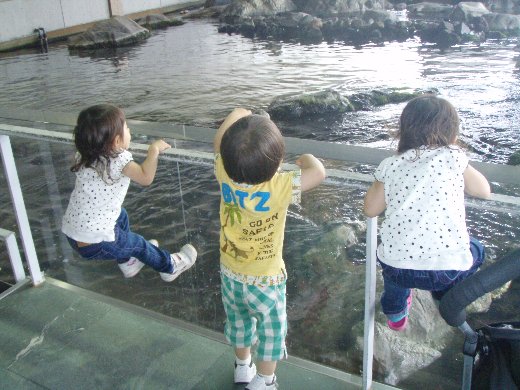 昨日は、クリスマスパーティーをしたメンバーで葛西臨海公園に行ってきました。こひよこさんは残念ながら出席できず、ヒナタ母さんとKくんとYくんで!前の日の私は、相変わらず予定があると思うと、興奮して(笑)眠れず本を読んだりブログを読んだりで3時就寝(^^;そして当日は雨の日のための計画も練った上で11時半に駅に待ち合わせ。早く起きて準備していたので、9時には終わり、早めに9時半ごろ出発。そうそう、出発前に2人は準備中にいつものように家の外で遊んでいたのですが、みかんがりんごの紙のお気に入りのバックを自転車で踏んで壊してしまったんです。で、悲しんでいるので、テープをはって直してあげていたんですが、りんごがその間、どうやって壊れたかを一生懸命説明してました。それは適当にうなずきながら聞き流していたのですが、最後に「それでね、悲しかったんだけど、おばさんがうるさいうるさーい!って言うからちいさくに泣いたの。」という言葉を少ししてから隣のおばさんがうるさくするとうるさいって言うから、小さい声で泣いたのって言ってると理解してびっくり!そんな判断ができるようになったんだー!(笑)で、出発してのんびりコンビニに払い込みで寄ったり、しつつ八丁堀で二度目の乗り換え。なんと八丁堀、エレベーターはおろかエスカレーターもなし!荷物も多いのにと苦労して階段を登り、改札を出たら、JRはこちらの矢印がまたもや階段のみの場所(涙)もしかしたら地上に出たら大丈夫かも?とか思って、地上へのエレベーターに乗ってみたらさっぱりのりくちはなく、しょうがなく、更に長い階段をまたもや降りそんなこんなで、ついたらちょうど11時半でした(^^;みなが集まるまで時間があったので、飽きてきた子供達のために、こんな事もあろうかと持ってきた先日買った網を渡したら、子供達のテンションが大幅アップ!(笑)道々網を振り回し、駆け回りながら歩いて行きました。まずは昼食、ということで、一応今回はピクニックなんだけど風も強いし寒いしとレストランに入ることに。皆でお弁当を食べたら、うちの子たちも珍しく一人で食べてくれて楽ちん楽ちん♪うちの子たちが食べるのが遅いので飽きてきたほかの子たちのために、次なる持ち物、寒天粘土を投入(笑)伸ばすものも、型抜きも持って行ったので、皆夢中で遊んでくれて親もゆっくり食事が出来ました♪その後は、水族館へ。水族館に入る前に滝のようになっているところで網で遊んだり売店で長い時間立ち止まったりしつつやっと中に入りました。(網はここでいったん取り上げられてしまいました)うちの子たち、ヒナタ君は覚えてたけど後の2人は覚えてなかったみたいでうちの子たちとヒナタくん、後のふたりの男の子の2グループに分かれてしまって水族館を見て周り、ペンギンを観察。うちの子たちはぺんぎんでテンションが凄く上がって、みかんはひなたくんと手をつないでずっと走り回るほど。かなりの時間をペンギンで過ごしてやっと皆が揃い、またもや売店へ。2個入りで500円のろうそくを発見して、二人の購買意欲を何とかごまかして(笑)水族館は終了。親達はぺちゃくちゃぺちゃくちゃしゃべりまくり、とっても楽しかった!その後網を受け取り、お魚釣り!と子供達が言っているので、どこか水辺へ行こう、と警備員さんに聞くと、公園の端っこの海のほうと教えられて、かなり遠いし、酷い風の中、そこまで頑張って歩いて行きました。やっと海に到着したものの、みかんは寝ちゃうし、浜ではサカナは取ることはできず、しかも波が来るのでりんごが海怖い!と号泣し始めちゃって困った!せっかく歩いたのに皆さんにも申し訳なかった~(^^;みかんを浜辺の砂の上に置いてりんごの相手をしてたんだけど、波が来て、みかんちゃんが持ってかれちゃう!早く抱っこして!って号泣してました(笑)やっぱり相方が大事なのね~(笑)それで皆で足を洗って戻ることに。なんだか疲れたよねー。ベビーカーに乗ったら子供達ねないかな?って親の期待に沿って次々と子供達がダウンしていき(笑)晴れて親達は駅前のマックに入り休憩。ヒナタ君とKくんだけが起きていて、2人は親達がポテトやナゲットを食べているので(断乳後初ポテト、美味しかった!)バクバクおにぎりを食べて嬉しそう(^^そうしているうちに、もう1人のYくんも起きてきて寝起きの不機嫌で泣き出したので、そろそろ。。と6時ごろマックを出ることに。一番網を喜んでいたYくんだったので、網を一つ上げてここで解散!解散と同時くらいにみかんが起床、帰りは八丁堀は嫌だわ、と東京駅を回って帰ってきたのですが(ほんとに広くて駅で随分歩きました。。)錦糸町についた頃にりんごも起床。今日は5時前に帰ってきていた旦那さんが錦糸町まで車で迎えに来てくれていて、楽ちんでした。帰って夕食、お風呂後、21時半にはみなで就寝でした。久々の再会は本当に楽しかった!是非またみなで遊びたいです(^^帰ってから2人に、楽しかっ