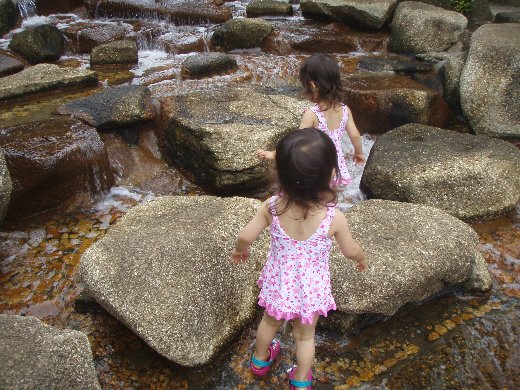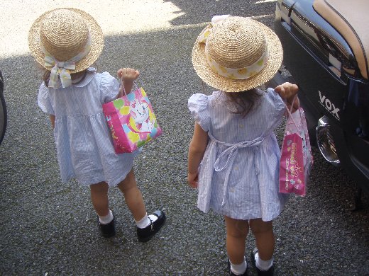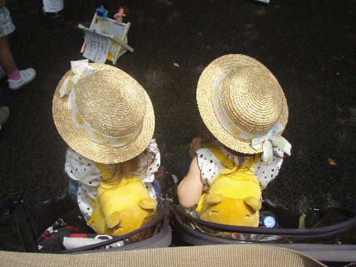 明日とあさってはおでかけなので、今日は3日分の食事作り。天気もよくなったから洗濯もたくさんしたし、お掃除もしたらすっかり疲れて今日のお昼は近所のファミレスへ(笑)2人がおでんしゃで行くというので、自転車にのってでかけました。食べてからもう一度最後の洗濯を干しに帰り再度自転車で公園へ。水着を着て本格的に水遊び→児童館でたっぷり遊び→帰って夕食、お風呂といつものコース。帰り道に歩道で全力で向かい側から自転車で走ってきたおばさんにみかんがふらーっと近づいていってしまったら、きゃー!危ない危ない!って叫んで、ちゃんとこういうの指導してくださいね、お母さんは!って怒られました。はい、ごめんなさい、とはいったものの、っていうか、歩道で全力で人が来てもスピード緩めないそっちのほうが危ないんじゃないの?と段々腹が立ってしまいました(笑)ああ、こういうときに、さっと「それはすみませんでした。でも、危ないので、自転車は車道を走ってください」とか言っちゃえる人になりたい、と思いました(笑)さて、ちょっとすぎましたが、15日に2人は2歳11ヶ月になりました。とうとう来月は三歳!早いものです。そんなわけで最近の2人です。まずは最近のおもしろ言葉から。・ところてんを、「ことろてん」・お船は「おっふね」・~けろ。例:これとれないんだけろ~。・語尾にもしかして~とか、多分~とかをよく言います。例:あ!あれ!前行ったよね、もしかして~。多分、やったと思うよ、もしかして~。(ママそっくり。多少間違ってる(笑))・大きな布を見つけると何故か腰に巻いて、「いらっしゃいませー」・いちこだけ。一個だけ、のこと。例:「いちこだけちょうだい!」・してごらん?例:ママもやってごらん?など、なんにでもつけます。これもママの真似。・ダメよー。例:りんごちゃんダメよー。パパが怒るよ!・~して、って言い方がいまいち微妙。拭いちゃして、脱ぎさして、取らさして、書いちゃしてなど。・お風呂嫌いなんでしょ?何で入るの?(笑)私、実はお風呂嫌い(笑)風呂に浸かる、んじゃなくてシャワーも嫌いなんです(笑)なのであまりこまめに入ってないんです(汚)お風呂はいつも旦那さんの仕事なのでまかせっきりなんですが、たまーに一緒に入ると、こんな風に言われます(笑)・レオマーク(西武ライオンズのキャラクター)を見るとあ!野球!ママの好きなやつ!(うーん、教育の成果あり♪(笑))それからトイレは、もうすっかり失敗することもなくなり、夜は3日に一度くらいだったお漏らしが、5日に一度くらいになってきましたが、ちょっと困ったことが。。。一つ目は、最近外のトイレでも私が支えなくても一人で、洋式は自分で座って用を足し、流せるし、和式もパンツだけ靴を脱がせて片方脱がせてあげれば、それを自分で持って用を足し、流せるようになりました。そのためにすっかり自信がついた2人。1人でできる!とさーっと1人ずつ個室に入って鍵をかけてしまうようになったんです(^^;結構ウンチの時は時間かかるし、個室の少ないトイレとかにいるときには更に気が気でないんですが、とってもマイペースに出たよー!!ちゃんと流したよー!と自信満々の顔で出てきます(笑)そしてトイレでもう一つ困ったことは、私が時々、トイレが近くにないときにはかげのほうで用を足させていたら、「オシッコ!トイレ行かない!ここでいいよ、できる!」ってあっという間にパンツをペロッと脱いで、なんでもない道の真ん中でオシッコしそうになること(笑)恥ずかしいったら。。。(笑)次に、以前、旦那さんの職場の方にシルバニアファミリーの大きなおうち(全ての細かい道具が入った)の中古のものを頂いたんです。これは、シュタイナー的には、ちょっと。。。とは思ったものの、私自身、子供の頃欲しくて欲しくてたまらなかったけど、結局買ってもらえなかった夢の(笑)シルバニアなので、どうしよう。。。と思い、荷物部屋の奥のほうに隠しておいたんです。それを数ヶ月前、断乳の日に東京ドームのおもちゃ王国でシルバニアで遊んでしばらくした頃に、りんごが、発見しちゃったんです。(多分前から見てたけど、これがあれだと認識した様子)で、それから頻回に、おうちが欲しい!おうちが欲しい!と大騒ぎ。しょうがないので、とうとう観念して三歳のお誕生日にあげることになったんです。で、それは納得してくれてますが、すぐ、もうお姉ちゃんになった!今何歳?って聞いてくるんです(笑)それをいいことに、最近は、言うことをあまりに聞かないときは、あー、じゃあ動物のおうち、いらないんだー、とかあげないけどいいねーってかるーくいうと、「しなーい!」ってあっさり言うことを聞くように(笑)かなーり楽です(笑)おうちをあげた後はどうしようと思うくらい(笑)お誕生日の日はおうちで遊ぶからお外に行かなくてもいいらしいですよ(笑)最後におっぱいの話。先日、ふと、おっぱい美味しかった?って聞いたんです。そしたら、うん、とさびしげな2