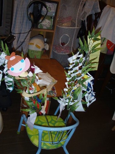 今日はさくらんぼの会でした。今日の朝はあいにくの大雨。昨日から準備していたので8時ごろから出かける準備をして三人ですっぽりレインコートをかぶり雨対策をしてやっと出発したらやっぱり9時。雨の日はなかなか大変です。10時から会が開始。今回はフリートークで、子供達が飽きてきたら七夕イベント、ということで、自己紹介をしてフリートークを一時間ほど楽しみました。子供達には最初から折り紙をしてあげて、その後早めにご飯を食べさせたので、機嫌が悪くなることなくイベントに突入。イベントは、マイミクのちーこさんが笹を、タイキングさんと私が飾りを用意して七夕の飾り付けでした。ちーこさんは田舎のご実家から笹を送っていただくことになっていたのですがあいにくの暑さで、すっかり送ってきた笹がしおれてしまったそうで残念ながら100均のプラスチックの笹に変更。でも本物の笹の葉をお弁当など用に何枚か頂きました♪プラスチックの笹は葉が落ちることもなくなかなか快適!私の用意した飾りつけは、短冊と、わっかと、タコ糸と、蛇腹切りをする折り紙とお星様で、人数分26セット用意。案外大変でした(笑)お星様がどうしても作れなくて、旦那さんに依頼したら真剣にPCで製図してプリントアウトして切ってくれたのでこちらも綺麗なお星様が出来上がりました♪タイキングさんがきらきら折り紙を用意してくださったので、こちらも使ってとても素敵な七夕飾りができました♪(家で先日住吉の保育室で作ってきた飾りもつけて完成!)その後お昼を食べて1時に解散。今日は2人が行きたい!というのを、押しとどめて児童室には寄らずに会場を出て、すぐにバスで錦糸町へ。ヨドバシ寄って、郵便局寄ったところで突然みかんの機嫌が悪くなり爆発!大変困ったので、先日葛西でヒナタ母さんにもらった金魚のシールを投入!(助かりましたよ!ありがとうございます!(笑))大喜びの2人は、どこかで座って貼る!というので、エクセルシオールでちょっとお茶。その後その地下にあるクイーンズ伊勢丹で、予定通り、子どもカートを持ってぐるぐる回り、さらに車に乗り換えてぐるぐる回り、三階にある、いつものマックの滑り台を楽しみ、隣の手芸屋さんでシュタイナーチックな布を買い、9階に上がって椅子つきの絵本コーナーを楽しみ、5時にやっと帰る!と言ってくれた2人とバスに乗って帰宅しました。みかんは食事中(6時前!)に寝てしまい、その後りんごと一緒にリビングの子どもコーナーを拡大してシュタイナーに少し近づけ、りんごも8時ごろ廊下で行き倒れ(笑)なかなか雨の日を上手に過ごすことができました(^^出来上がりはこちら↓(前も写して置くべきだったなあ。全部が重なり合ってごっちゃごっちゃだったんです(^^;多少プラスチックもありますが、まあそれはおいおい変えて行きましょう。。)←もし良かったらぽちっとお願いします!