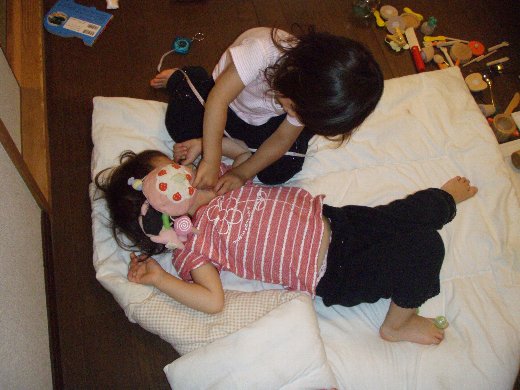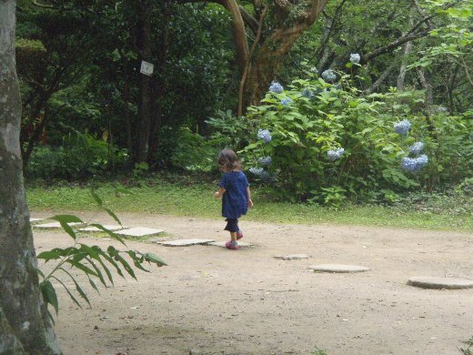昨日は早く寝て今日も珍しく7時半過ぎまで寝させてもらったのに、今日もねむーい。。。お疲れかしら。。。今日起きて見たらもうすっかり部屋はあれあれ(涙)昨日あんなにすっきりだったのに。。(^^;とはいえ、それを片付けてあげたら、普段はあまりおもちゃで遊ばない2人なのだけれど初めてみるおもちゃのように色々なおもちゃで楽しく遊んでいました(^^その間に更に片づけを進め、やっと全て完成♪これでシルバニアが来ても多少気が楽だわ。。。その後ご飯を作って食べて、自転車でいつもの公園へ。水着で水遊びをして、3時から児童館に移り、一時間ほど遊んで図書館で本を借り、帰宅。この写真は、みかんが派手に転んで泣いている時にりんごがこの石を渡りきっていてびっくり!以前は私と手をつないででも怖がってダメだったのに。。。是非みたくてもう一度リクエストしました♪みかんは食べずに寝てしまったのだけれど、りんごは夕食を食べて、起きてきたみかんも食べて、二人で一緒に8時半ごろ寝てしまいました。(ラッキー(笑))さて、今日の話題もまずはちょっとシュタイナー的な小話。一つ目。夜寝るときに鬼が来る、をなくしたところ、鬼が来ないから寝ない!とやっぱり言い始めたので、今度は怖がらない、前向きなお話をしてみました。「毎日ご飯を食べるとみかんちゃんとりんごちゃんの体くんが段々元気になっていくんだけど、そのあとに早めにネンネするとカラダくんがぐんっぐんって(こぶしを一緒にぐんっと上に上げた)元気になって、段々大きくなってお姉ちゃんになるんだよー。遅くネンネすると元気にならないんだって~。」そうしたら、それ聞いて目をきらきら輝かせて、「ねるっ!」だって(^^良かった~。脅さなくても、こういうやり方でもうまく行くんですね♪(でも、結局、寝ないと大きくならないよーっていいながら寝るようになってしまって、(誰もそんなこと言ってないのに)前向きな話のはずがちょっと後ろ向きになってしまいました(^^;)二つ目。ごめんなさいのこと。前々から気になっていたことがあって、児童館とか公園とかで他のお母さんとかと絡んだりするときにいまいち気になってしまって嫌だったのが、何かあったらすぐにお母さんが飛んできて、(ってなくても未然に)「ほら!ごめんねは!?何でいえないの!?」なんて子どもに怒ったり、ちょっと上のお姉ちゃんとかが、「かーしーてー」って言って有無を言わさず取り上げたり、言えば必ず貸してもらえるものだと思っていることだったんです。最初の、ごめんね、は、いまいち自分でも原因が分からないけれど、嫌だったのでうちの子たちには、他の人から見れば、最初のうちはごめんもいえない子、ということになるかもとは思ったけれどほんとに悪いことしたなって時には「痛かったみたいだよ?それはかわいそうだよね、」ってうちの子どもには話して、相手の子には「ごめんね、痛かったね、大丈夫?」って言う感じの対処をしていました。(まあ、うちの子が滅多なことでは人と絡まないし、人に謝らないといけないことはしないので、のんきに構えられるのかもしれないんですが)で、先日の住吉のシュタイナー勉強会でやっぱり1人のお母さんが先生にした相談を聞いて気付きを得たんです。そのお母さんは、自分の5歳の子が、何か悪いことすると、とりあえず、「ごめんね」って言うんだけど全く心がこもってないなって感じのごめんね、だし言えばそれでいいじゃんみたいな感じに思っていて、どうすればいいでしょうっていう質問をしたんです。で、先生は、「それは・・・そういう風になるようにしたんですよね。。。まずはお母さんが、本心からそういうことを言うようにしたらどうでしょう。」なんて返事をしたんです。で、やっと自分がしてきたことの理由がわかった感じがしました。今皆がしているような、ごめんなさいは!?って言うとりあえず謝らせるっていう行為は、心が全然こもってないんですよね。とりあえず悪い事したときはごめんねって言わせるって言う躾なんでしょうが、本心じゃないことを言ってもしょうがないんじゃないの?って思ってたんですね、私は。旦那さんにこの話をしたら、それが日本人なんじゃないって言ってましたがそうなんでしょうね。いい点でもあり、悪い点でもある。私って、良くも悪くも思ったことしか言わない人なので、お世辞も言わないし悪いと思わなかったらごめんなさいも言わないし(笑)人から見れば気遣いが足りないんでしょうが、うーん、でもやっぱり子どもには、本心からごめんなさいを言ってもらいたいなーと思うので、私のやり方は間違いなかったなーと思ったのでした。で、かーしーてっていうのもしかり。かーしーてっていって奪い取ったり、じーっと言ったあと、早く貸してよ、どいてよって感じで偉そうに(見える)待ってるのは、おかしいと思うんですよね。貸してって言われても、かしていいときには貸したらいいし、貸し