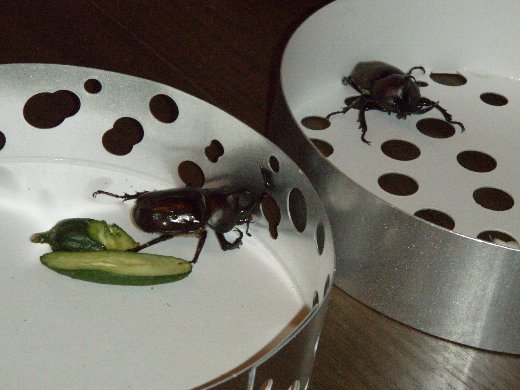 一昨日の夜は、旦那さんが二匹カブトムシを買って来てくれました。八百屋さん(!)で、一匹250円だったんだって!(笑)起きていたりんご、興味深々ながら、かなり怖くて、カブトムシが動くたび後ずさり(笑)三人が寝たあと、静かになった我が家でがさごそがさごそ、私もちょっと不気味でした(笑)翌日起きてきたみかんも、同じ感じででも次第に慣れて来て、夜には自分で箱をあけてつんつんできるように(^^夕飯のとき、きゅうりの漬物みたいの頼んだら、あ!あれ!虫さん食べてたやつ!って言われちゃいました(笑)さてさて、昨日も今日も忙しい一日でした。昨日は、昼ご飯後、1時から、近所の児童館のお祭りでした。事前に子供達には、1人130カッパ(お金の単位(笑))私は50カッパを頂いていて(ただで)、全てそれで会計することになっているお祭り。いつものようにおでんしゃででかけてみると、もう大賑わい。まずは10カッパでヨーヨー釣り、上手につれました。そして氷が食べたい!という2人のために、行列に並んでシロップナシのかき氷(30カッパ)をゲット。私も食べようかなあと思いつつも、カッパを残しておこうと買わず。(あとで後悔(笑))座って美味しくかき氷を食べて、今度は児童館内へ。5階では、バザーコーナーで、2人は大きいぬいぐるみ3つ入って20から30カッパの袋を抱きかかえ、ゲームに並びました。3つのうち、一つの紐をひっぱると上からおもちゃなどが落ちてくるゲーム(20カッパ)なんですが、相当並んでいて、全然進まないなーって思ったら、どうやら先生が人によって景品をかえているんです!(笑)なので、皆もらったものに大喜びしてました(笑)やっと我が家の番が来た時に、アレルギーで食べられないのでできれば食べ物以外でお願いします!!とムリを言ったところ(笑)なんと!ディズニーの目覚まし時計、熊ちゃんのぬいぐるみのストラップ変なストラップ二種の他に、多分食べものの代わりで、みかんにはたくさん磁石の線路が入った電車ボックス!りんごにはぷーさんがついた布製の可愛い鏡が落ちてきました!2人はそりゃもう大喜び(^^古本コーナーでは、図書館でいらなくなった地方の旅行雑誌を10冊10カッパで購入してホクホクの我が家(^^4階のゲームコーナーも顔を出したものの、全て景品がお菓子だったのでそこはやめて再度外へ。そして今度は、木工教室へ。1人10カッパで材料をもらい、本物の大工さんが2人に根切丁寧に指導してくださり、小物入れを作りました。木に線を描いてくれて、きりやすいように切り目を入れてくれて2人にのこぎりをひかせてくれ、釘を半分くらいまでうって2人にとんかちを打たせてくれて、二人も自分で作った!と超満足そう!普段家に、とんかちつきの積み木があって、毎日とんかんやっているせいか釘がすんなりトントン入っていってびっくりしていたら、大工さんたちもこんな小さくて釘がちゃんと入るの初めて見た!ってびっくりしてました(^^ただ、、、木屑で、子供達も私もちょっと呼吸が苦しくなってしまいました(^^;そろそろ時間も終わりなので急いでかっぱを使わなければ!ともう一度ヨーヨー釣をし、川でゲームをして、景品がお菓子でもいいや!とおむすびころりん(おにぎりを転がす)に並んでいたら、雷が!!!途端に泣き始めた二人!抱っこー!抱っこー!って言われても!今日もらった大量の荷物を抱えてとてもとても(><)頑張って2人を自転車置き場まで歩かせ、怖くてこげない~(><)となく2人の自転車を押して、急いで帰宅!お布団を取り込んだら、何故か雨は降らずでした。カッパ、40くらい余らせちゃった~残念(><)(笑)でも2人はめちゃくちゃ面白かったみたいです(^^↓こちらがつくった小箱ともらったものの一部。そして急いで片付けて、汗かいたので着替えて再度出発!すっかり天気になっていて、バスで錦糸町へ。今日はなんと急なお誘いで、元祖アレルギー仲間(笑)たちと呑む事になったんです♪我が家のみ、子連れと言うことで(笑)我が家の近くの錦糸町の、いつもの(笑)ワタミのお店で飲むことに。5時半の待ち合わせで、20分ほど早く着いたので、すでに少し眠くなっている子供達を起こすため、子供達の大好きな雑貨屋さんに連れて行って、買おうかどうしようか悩んでいた、豚の可愛い水筒@400円(笑)を購入、ご機嫌の2人を連れて待ち合わせ場所へ。5時半になり、たかりんさんとかんかんさんと一緒にワタミに行きました(^^とりあえず頼んだお水でインタールを飲み、最初に頼んだ焼き鳥が運ばれてきて2人は夢中でお弁当+焼き鳥を食べ、あっという間にりんごは就寝♪1人になればしめたもの(笑)、みかんは私の膝にのって、今日もらった電車セットや、持ってきたパズルで大人しく黙々と遊んでくれました♪その間に私たちは爆笑トーク(話しすぎた(笑))アレルギーの話も皆悩みは一緒で面白かった~。19時ごろお仕事を終えてきよっぽさんも合流。宴もたけなわ、20時前にはみかんも就寝♪そしてお仕事を終えて帰ってきた旦那さんが怒りつつも迎えにき
