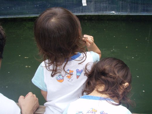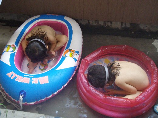 楽天ブログ10万アクセスまであと60弱!明日のうちには到達しそうです♪さて、私の一日の始まりは、いつも6時過ぎに起きた子供達を旦那さんが面倒見てくれて、叩き起こされて今日の食べるものを寝ぼけつつ伝えて与えてくれて、出て行く7時半頃に起こされる感じです。で、最近旦那さんが出かけるまで寝ている私に激怒していて、朝はいつも怒っているので、頑張って最近は早く寝るように努力していたんですが昨日も疲れてるからと11時に寝たのに、今日もどうしても起きられない。。。出て行くときに3人が激怒していたのでしぶしぶ8時前に起きたんだけどいつもは頑張って起きればそれでも1時間くらいするとすっきりしてくるんだけど午前中いっぱいだるくて眠くて、とにかく不機嫌。昨日のプールのせいじゃないって旦那さんに言われて納得(よわっ)でしたが・・。それで何とか不機嫌なまま朝御飯を食べさせて洗濯して、今日は旦那さんが飲み会のため、ご飯は超手抜きで、終了!早速小さなプールを用意してベランダでプール遊びをさせてあげました。2人はこれなら痒くない!楽しい~!と超ご機嫌。良かった良かった。こちらはメガネで覗く2人。そのまま流さないでね!と言われて放置しておいたら何度も何度も入ってました(^^これならお風呂に勝手に入らないから水道代が節約できそう。。。お昼を食べさせて、もうだめ、、とちょっと昼寝をさせてもらいやっと復活して3時ごろからお出かけ。今日は亀戸中央公園に網を持って魚とりに出かけました。でも私も都会っ子なので(笑)近寄ると逃げてしまう魚たちにどうしていいやら皆目検討がつかず(笑)一匹も触れることなく終了。いつも外では遊んでいるけれどやっぱり都会っ子な2人は背の高い雑草の間を歩くのが痛い!怖い!と泣いて抱っこで歩かされてがっくり(^^;でも楽しんでくれました。プールがなくなり、暑い場所では痒くなる今、遊ぶなら木の多い公園かなと思ってましたが、まあ今日は涼しかったのもあったけど、やっぱりうっそうとした公園は過ごしやすくていいですね(^^(蚊にはさされまくるけれども。。。)そしてサンストリートに移動して、夕食を食べ、ちょっと買い物して帰宅。午後も頭が痛かったけど、夜になったら復活してきました(笑)さて、今日は子供達の小話を。この間2人と、何かの話の途中で、「だって2人とも、ママのところに行きたい!!って言って来てくれたんでしょ」って言ったらみかんが「ううん、みかんちゃん、パパの所に行きたいって言ったの」だって(笑)がっくし(笑)それでりんごがママのところに行きたいって言って来たんだって。それで双子になったのね~、納得。ちなみに先日おなかの中でかえるのうたを聞いていたって言ってるって書きましたがあれを読んだ母に納得の話を聞きました。この子達が1歳くらいの頃、母と祖母が何度も何度も歌って聞かせたそう(笑)どうりで、普段ほとんど聞いたことのないかえるの歌が出てくるのねー(笑)それから、絵本を読んであげていて、結婚について聞かれたので簡単に説明して、二人は誰と結婚したい?って聞いたら、お互いとしたいんだって!(笑)だっていつも喧嘩だよ?って聞いたら(笑)それでもいいんだってー。やっぱりすきなのねえ、相方が。それから体重を毎日私は測っているんですが、それをみると2人も真似したがって必ず体重計に乗り、何キロ?って聞かれます。11キロって教えてあげると、ママは?って必ず聞かれるんですよね。最初のうちは正直に答えてあげてたんだけど、○○キロになりたい~!私、○○キロだよ!とか大声で言うので、慌てて常に45キロと教えることにしました(笑)年齢なら大きな声で言われても困らないんだけどねえ。さすがに体重は。。(笑)あと、実はみかん、相変わらずじぶんのこと、りんごって言います。マイミクさんのブログを読んでたら、3歳児検診では親の名前を聞かれたりするらしく、それどころか自分の名前も言えないんだよな~(笑)でも本人も間違ってるってわかってて、りんごにもいつも指摘されるし、このりんごちゃんって自分の事指差して必死で言うのでかわいそうで私は特に指摘もしてないんだけど、どうしてなんだろうなあ?みかんの最初の文字が言いにくいのかなと思ってたけど、ママの”ま”なので、いえるはずだよね、って友達に言われて確かに。。。(笑)不思議です。(ママのお名前は苗字からいえるんですよ!(笑)パパは何回聞いても忘れるみたいだけど)それともう一つ、色もぐっちゃぐちゃな2人。相変わらず、青を赤って言ったり、黄色をピンクって言ったり、緑を紫って言ったりします(笑)信号も青になったら渡るって言っても、なのでさっぱり伝わらないんです(笑)ついつい色盲を疑っちゃいますが、まあ遺伝子的に考えてありえないし。。。こんなに昔から色には強いこだわりがあって大好きなのに、これも不思議だなあ。それから昔モンテッソーリの本を読んで、これは面白い!と思ったのが子供達にやり方を教える方