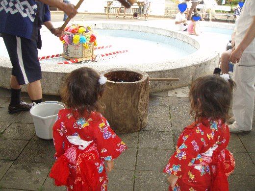今日は実家のマンションの夕涼み会に行ってきました。急いで用意をして出発したのが10時過ぎ。ごとごと一時間以上電車に乗り、11時半ごろ実家駅に到着!実家で弟と待ち合わせの予定だったのですが、もうそばにいるとのことで子供達もおなかをすかせて騒いでいたので、駅ビルで待ち合わせレストラン階に登るとこみこみ!すでに薬を飲ませてしまっていたので慌てて近くのびっくりドンキーに移動しました。久々のびっくりドンキー。私はホットピリからハンバーグを頼んだのですが明らかに、肉が少ない、中に加水分解酵素とかを入れて水増ししてるのがわかる、ハンバーグでした(^^;こういうの味でわかるようになったとは、ちょっと嬉しいなあ(笑)子供達は楽しげな雰囲気と久々のおじちゃんの登場にテンションめちゃめちゃ高いままご飯を終了。実家に戻るはずが、とりあえず用事を済ませてしまおうとそのまま車で移動することに。今日の用事は、横浜シュタイナー園のそばに住んでいる弟がその近辺を車で案内してくれる、というもの。地図でみてめぼしをつけていた場所がいくつかあったのですが、かなりイメージとは違い、ちょっとがっかり(^^;その後弟の新居に行き、公園!と言う2人のために四季の森というところにちょっと立ち寄りました。入り口の噴水を見た二人は、やっぱり、お水はいる!入る!と大騒ぎ。パンツ一枚で遊ぶことに。遊んでいるうちに噴水が降ってきだして2人は大喜び。しばし楽しく遊びましたが、次第に2人ともめちゃカイカイに。。やっぱりダメなんだなあ、こういう水。急いで水道水で体を洗い、落ち着き一安心。靴が濡れてしまったので西松屋に行くことに。車中で2人が寝てしまったので、西松屋で靴を買い、急いで実家へ。2人をたたき起こして浴衣を着せると、去年すそ上げしてもらった浴衣がすっごく短くなってる!大きくなってないなあって思ってたけど、ちゃんと成長してるんですね♪急いで下に下りると、4時45分開始の子供神輿が目の前で行っちゃった(><)ああ、間に合わなかったぁ。。。なので残念ながら、餅つきを観察し、出来立てを私だけいただきました(^^久々の地元の集まりで、たくさんの人に声をかけられたんですが、いかんせん人を覚えられない私(笑)覚えてる~??なんて声かけられてもいーえ全然とはいえないのがつらいとこです(笑)(顔は見覚えがあるんですけどね)全てが安い縁日なので、子供達はばーばに貰った100円でディズニーくじとシャボン玉を買っても40円余るほどで(笑)私も150円の缶ビールや50円!の枝豆を堪能(笑)そして、実は、昨日、父が退院してきたんです!が、その父も喜んで縁日参加。9月に救急車で運ばれて以来、初の元気な姿を皆さんに見せることができました(^^一通り満喫して、そろそろおなかがすいてきた二人でしたが、そこに現れた風船芸のお姉さんに目を奪われしばし鑑賞。私も幼馴染がいておしゃべりしたり出来ました♪6時に家に戻り、色々母が買いあさってくれた食べものと、子どもはお弁当で夕食タイム。父も普通に何でも食べられるようになっていて、家族4人でしみじみと父の無事を喜びました。ほんとなら、倒れたあのときに死を覚悟していたのに、まさかこんなに元気になって穏やかに過ごせるようになるとは。。。本当に感激です。家族が久々に集まったなあと思いました(^^夕食を急いで食べて、7時から、今度は弟と子供達と4人でビンゴ大会へ。ビンゴといえば絶対当たらない私なのですが、今回もさっぱり。穴は開けど、商品がもらえる場所にはなかなかいけないので、2人も怒り気味で、段々痒くもなってきてきげんわるーい。。。そこへ、最後のほうにみかんがやっとビンゴ!急いで景品のほうに行くと、もうほとんどない景品の中に、みかんが一番喜びそうな、キティーちゃんのビニールのバックが!みかんは大喜びで取ると、りんごがりんごのはー?とやっぱり怒り出し、取り上げようとし、皆さんの前で大喧嘩になりかけたところで弟がりんごを抱き上げ強制撤去(笑)りんごをなだめてビンゴの続きをしましたが、もうお菓子と宝くじしかないのは目に見えていて、どうしようか、と弟と目で合図してました(笑)みかんはそんな私たちを横目で見つつ、カバンに大喜びして、「たのしいぃぃぃ~」ってお気楽なせりふ(笑)それが最後の番号で何とりんごがビンゴ!2個の商品を8人でじゃんけんで争い、負けてしまい、とうとうりんごには何もなし。。。騒ぎ出そうとするりんごに、多分母なら何かしら溜め込んでいるだろうと思い(笑)ばーばに貰おう!ばーばが持ってるから!!と説得して家へ(笑)ばーばに説明したところ、案の定いい感じのカバンが出てきて、りんごちゃん、これが欲しかったの~。良かった~とやっとご機嫌になってくれました。皆でお風呂に入り、眠さが限界だった私に母が寝てていいよと2人と遊んで寝かしてくれるうちに旦那さんが10時前に帰宅!車で家に帰って来ました。そうそう、パパが、何とまたもや
