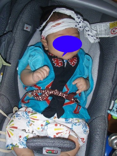 昨日は朝起きるといい天気!楽しみにしていたお祭り、牛島神社の大祭です。朝大急ぎでご飯を作りお洗濯をして祭りの衣装一式を出してくると二人は大興奮。ぶどうくんにもヒナタ母さんに頂いたお祭りのお洋服に(まだ大きいと思ってた70サイズなのに、ぴったりでしたよ!!ありがとうございます(^^昔弟が着ていたはっぴを着せて鉢巻をつけて用意完了♪みこしのあるほうへ向かいました。すでに10時出発の小神輿が出発してしまっていて一生懸命追いかけて後ろ部分を持つというよりはぶら下がる2人(笑)しばらく歩いていつも遊ぶ公園で一休み。今まで参加させていただいていたお友達の実家町内のお祭りは一休みは全てお菓子だったんですがうちの町内のお休み場所には縁日が!一円玉落としと輪投げをしてまたガラクタを貰いテンションアップの2人(笑)その後も町内をぐるぐると回っては休みを繰り返したんですがその後の頂くものは、ヤクルトだったりお茶だったりで2人は貰えず、しかもドンドン気温は上がり、お神輿にはぶら下がってるのに重いらしく(笑)段々ぐずぐず言い始める2人(^^;結局お神輿のそばを歩いて周り、途中で太鼓部隊のほうにもっと小さい子向けの綱を引っ張る一団がいるのに気づいてそちらに鞍替えし、2時間ほどで町内の闊歩が終りました。その後二列に並んでお土産を頂いたら、グレープフルーツ、40%りんごジュース、お菓子(袋)が6つ、お稲荷さんとかんぴょう海苔巻きとそりゃたくさんのお土産を1人づついただきました。ジュースは100%だったらちょっと飲ませてあげようかと思ったんですが、40だったので飲むことが出来ず、昼食後に初のグレープフルーツに挑戦!それで満足してくれて助かりました。午後はパパがしばしお昼寝、私はPCでのんびりした後オリナスへ。私の美容師さん、近所だったのにオリナスに移動になってしまったので追いかけて行ってきました(^^島根に行く前に行きたかったので、行けてよかった♪ぶどうくんがおっぱいが必要になったときのためにパパと子供達も待機してもらっての美容院でしたが行きの車でぶどうくんが大量にうんちをした音が聞こえたので四人とはベビザラスでお別れ。一時間ちょうどで美容院を終わり、合流しました(^-^)ぶどうくんはぐっすり眠ってていい子でした♪しばしそれからオリナスで遊び、車で帰宅して再度出発。頭が痛いという旦那さんを置いてはっぴを返しに行き公園へ。6時まで遊びやっと満足してくれました(^^;)←もし良かったらぽちっとお願いします!