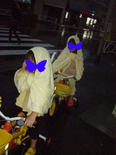 昨晩…、夜中に久しぶりに二回号泣&盛大なかいかいがあったのはやっぱりわたあめかしら(^^;)そして今朝は17個目、最後の新規幼稚園、2つ隣駅の区立に行きました。小雨の降る中、昨日パパにサドルをあげてもらったのが嬉しくて↑二年間あげなかった(笑)どうしてもおでんしゃでいく!というので濡れながら自転車で行きました。かなり遠かったけど、元気に到着。結構距離があったけどすんなりついたので、これ位の距離なら自転車三台で通園もありかも?広さはまあまあ、土部分なし。子供たちがおもちゃで遊んでる間に見学させてもらいましたが、工事したばかりで綺麗。↑区立はほとんどの園で耐震構造が引っかかり皆一気に工事してるんですよね。プールは小学校と共同のが週一、独自の組み立て式のやつに毎日入るそう。もちろん塩素は入れてます。動物は年長さんのお部屋にうさぎ。食イベントは他と同じ程度であとはなし。中でも小学校とつながっていて、体育館や、その前の玄関スペースでも自由に遊べるそう。先生もなかなかいい感じでした。アレルギー的に楽だけど、でも塩素入りプール毎日はきついな~。見学したあとは、おもちゃで更に遊んで、その後こないだの幼稚園でも来てくれていた出張相談の先生がいたので、皆でボール遊びを小学校の玄関スペースで楽しみました。12時半頃終了し、お弁当を食べる場所を探して、公共の建物へ行ってみました。が、食事を出来るところがなくて結局外で寒いランチに(笑)その後その近くの児童館へ行って楽しく遊びました。ほぼ独占状態だったのでおもちゃだしまくりでやりたい放題(^^;)帰りは本降りになった雨の中(涙)、途中の激安ショップでバスタオルを買い黄ずきんでなんとか帰宅しました。暖かいお風呂に入ったものの、りんごが咳してる~(>__