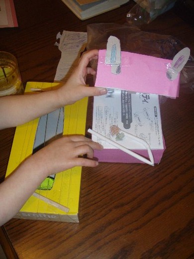 昨晩は2人とも凄く痒かったんです。顔もパンダみたいになってるし、なになに???食べものは特に食べてなくて。。。考えられるとしたら、ダニゼロックはかかってて安心しちゃってる布団でばたんばたん飛び回って遊んでたせいかしら??ダニゼロックも万全じゃないですもんね。もう布団で遊ぶのはやめたほうがいいよと伝えました。。ぶどうくんのほうは、もう一つ書き忘れてたけど先日より便が微妙なんですよねえ。バケツでさせると、形が出来てきていてお兄ちゃんウンチで食べものの効果は大きいな!と思うものの回数が今までは一日二回だったのに10回くらいに増えちゃって、オムツがぬれるたびにうんちしてる感じ。下痢なのか??離乳食、裏ごしが足りないみたいだから刻みにしたんだけど、それが早かった???よくわかりません。そして私のほうは、夜中もまだまだ胃がいたかったけど朝は良く噛んで食べたら回復傾向が見られて一安心。でもまだまだ頭が痛いです。。。そして旦那さんも、今朝、頭が割れるように痛いって言っていて(笑)風邪が家族でまわりまわってるようです(^^;そんな今日はヤマハの日。天気がいいので自転車でヤマハへ。今日も今週ずっと苦しんできた課題が何とかこなせて特に難しい新しい曲も出てこず、一安心。次の曲に取り組んでいるときに、先生が、この曲は、左手のところがこの間の曲と同じなのよ、と言ったら、ほんとだ!ヘ音記号がある!と子供達が口々に言ったんですが4と3もある!って言った声がなにやらうちのみかんの声に似てる!後で確認したらやっぱりみかんが言ったようで、ちゃんと4分の3拍子の文字を見てたんですねえ。みかんって、目の付け所が面白いって言うか見るところ見ていて面白いなあって思いました。で、何とかこなしてるみかんではありますがこれにはかなり並々ならぬ努力と言うか。。。(笑)毎日毎日つきっきりで練習してるんですよねえ。おかげで何とかついていってはいるけれど根本的に何が問題かって、右手と左手がどっちかわからないこと、と、親指、人差し指を1の指、2の指って呼ぶのがどうしても受け入れられずに、3の指を中指に置いてって言われると、どうしたらいいかわからないことなんですよね!(笑)そして、結構宿題をしたり何度も確認したりしてるけど譜面のドレミファが全くわからないんです。ドはわかるらしい。けど、レ、ミ、ファが隣り合う音なのに、五線の間、五線の上、と進んでいく法則が全く理解できない様子。そして、今度は応用で、音が飛ぶ(そ、み、とか)と全く指と頭がついてかない。。。(笑)そしてわからなくなると、機嫌が悪くなって眠いって言ってやめちゃうんです。りんごのほうはどれもこれもぱっと理解してさっさと出来て、ついでにやってないことまで出来ちゃうんですよね。私もりんごタイプの人間なので、みかんがどこでつまずいてるのかいまいちわからないんですよね。楽しくやりたいはずなのについいらいらしちゃう。別にやらなくてもいいことなのにね。それでこの間旦那さんに、私にはわからないからパパが教えてみて、と頼んだんです。旦那さんによると、俺も、不規則に黒鍵があるのに何で半音ずつあがるって5線上では言うのかってのが凄く納得行かなくてつまずいたから、多分みかんもそうなんじゃないか、と言うんですよね。みかんは俺と似てるから、音から入って体で感じるよりも理論を学んで、納得したほうがわかるんじゃないかって。なるほど!と思って。で、長くなりましたが、4分の3拍子の字をちゃんと見ていたみかんに、やっぱり私とはポイントが違うわ、と思ったんです(笑)最近2人を見ていて、りんごには、ヤマハの方式は向いているけれど、みかんには、個人指導の基礎からしっかり教わって理解しながらやるピアノのほうが向いてるのかなあ、って思うんですよねえ。それでみかんに、先生が1人ずつ教えてくれるのもあるんだよ、それにする?って聞いたら、お友達がいたほうがいい!って。でも、幼稚園に行って、お友達がたくさん出来たら、そういうほうに替わるのもありな気がしますね。と、話が脱線しましたが、そういう感じで今日のレッスンはおしまい!途中から雨が降ってきてしまったので自転車できてしまった私達は、ベビーカーに私の上着でカバーしたぶどうくん以外は寒い寒いといいながら濡れて帰宅しました。途中でおばあちゃんが、濡れてかわいそうに!と家から骨の折れたビニール傘を一つ持ってきてくれて、みかんとりんごが交代で自転車にかけて多少雨しのぎが出来ました(^^写真は2人が作った犬のおうち。二階建てで階段があるんだって←もし良かったらぽちっとお願いします!