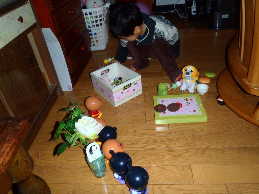11月18日。結局夜中ちょっと目覚めたくらいで起きることもなく朝を迎えました。夜中に目覚めたのは4時ごろだったんだけど、、、あ!りんごいないよ!りんごは、なんとあんなに寝相が悪いのに、暴れることも、一度も目覚めることもなくもちろんベッドから落ちることもなく静かにずっと寝てたらしい!びっくり!ママと寝ないのも初めてだし。。。さすがもうすぐ小学生だわ。。。で、朝、今日も早くいくと二人。私が起きた時には、りんごは制服に着替え、持っていくリュックに、ズボンを入れてキッチンに置き、準備万端!幼稚園のイベントに向けて一生懸命作ってるんだよね。子どもの作品展があるんだけど、子供たち、自分で考えた”おもちゃ”に関係するものを木で作ってるんだって。一人では作れないような大きなものを毎日とんかんとんかんしてるみたいで、先生はたまに手伝うくらいらしい。人が入れるくらいのおもちゃ入れ場を作ってるんだって。どんなものができるのか、楽しみだなあ。(こういう自由な制作がしてほしかったんだよね!)朝から超機嫌が悪かったぶどう君は、着替えないと裸で大泣きしてるので、置いて行って、子供たちを送った後は帰宅しおっぱい飲ませてパソコンタイム。ラジオを聴いたりパソコンしたりして、、、日記を書いていて、今日の給食はなんだっけ?ってメニューを見に行ったら、、、サツマイモご飯に黒米って書いてある!!!黒米はダメなのよ!かゆいのよ!と大慌てでぶどう君とご飯を届けに行きました。そして帰り道にお買い物をして帰宅しまたパソコンタイム。。。お昼を食べて、今日は2時降園なので、急いでお迎えに行きました。お迎え後は、今日は明日のピアノが変更になって4時に先生が来るので、ちょっと遊ぶのはやめて、あれこれ用事を一緒にすませることに。まずはこの間の美容院へ借りたものを返しに行き、お礼を持ってったのに逆にCdに焼いた写真をいただき(ちゃんとCDの表面にも着物の写真を載せてくれた♪)写真が出来上がったと聞いていたので写真館に行ったら今日はお休み。お次はこの間発表会の時に頼んだお花屋さんへ。後日お金を払いに行ったらめちゃくちゃ素敵なお店で、手作り雑貨も置いてあるというから今度二人を連れて行こうと思ってたんですよね。この間のお花にかわいいウサギのピックが入ってたんだけど、案の定ピックに夢中の三人だったので一つづつかわいいピックを買ってあげました。みかんはバレエみたいなピンクのくまちゃん、りんごは、かさを持って飛んでる人形?ぶどう君には門のところで犬が待ってるやつ。どれも多分手作りなんだよね。。。超かわいいの!そしてそれを刺すためのオアシスも買って次へ。次は薬局で配っていた塗り絵を渡すとプレゼントをもらえるというので三人が渾身の力で塗った塗り絵を渡しに行きました。貰ったプレゼント、、、練乳入りのお菓子だった(笑)残念(^^;そして最後にダイソーへ行って、オアシスを入れるための入れ物と、造花を一つずつ買いました。入れ物は結局ガラスのコップになった。それぞれは安いものなんだけど、、、完全に無駄遣いよね(笑)ま、いいんだ、ママが気に入ったんだから(笑)急いで帰ってきてピアノの先生が到着し、ピアノの間に明日のご飯づくり。すぐに終わったので残りの時間は勉強してすごし(ぶどう君はばあばと遊んでた)先生が帰ってから皆でお花をいけました。オアシスを切り取ってそこにピックと造花を指すだけなんだけどね(笑)ママはもっときれいな造花にすればいいと思ったのに、でかいバラを選んだ二人だったのでかなーり大味なお花が出来上がりました(^^;途中でぶどう君はおっぱい飲んで就寝しちゃった。その後は夕食を食べ、終わったころ宅急便が来て、、、オークションで入札したさんすうセットが到着した!おかげで二人は大喜びで一緒に夢中でさんすうのお勉強(^^そして今日は二人ともばあばのところで寝る、と9時にお部屋に行ってしまったので私は一人でのんびりお風呂に入ったんですが、、、出るころになってみかんが、ばあばの部屋、ちくちくするし、かゆいけど掻いてくれる人がいない。やっぱりママとがいいって帰ってきました(^^;なのでその後は背中を掻き、抱っこで寝かしつけする羽目に(^^;まあばあばもシングルベッドで三人はきついだろうからよかったよね(笑)さて、ちょっと小話。この間義母の判断基準がお金に関することかどうかだった、と書きましたけど、、その続き。お金に関することはすごくきっちりけちけちするけど、それ以外はそうでもない、とわかって、大体行動パターンの説明はついたんですが、まだちょっと疑問だったのは、あちこちの電気を消したり、水をちょっとずつ使ったりとかはすごく気にするのに、何ですごく電気を食うテレビはいつもいつもつけっぱなしのまま部屋を開けるんだろうってこと。夜とか明らかに寝てる(いびきが聞こえる)のに、テレビはずっとついてるし、お金で言ったら