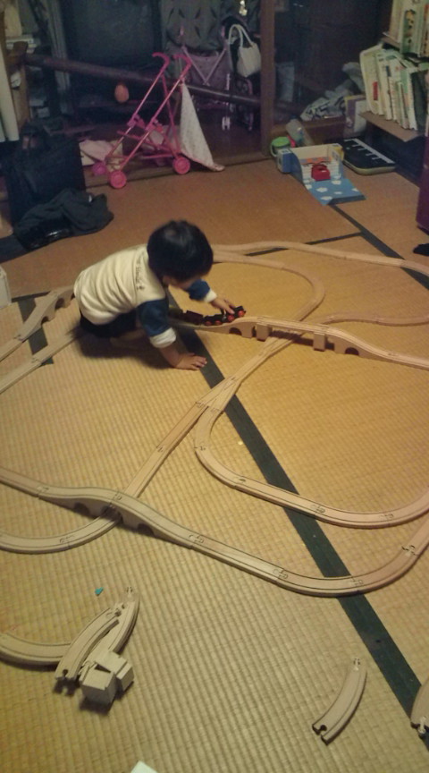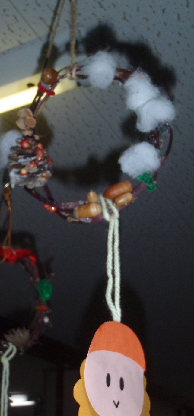 11月19日。今日は久々にのんびり寝かせてもらって朝ご飯。朝ご飯はそうめんを食べ、明日のご飯づくり。終わった後は子供たちが楽しく遊んでるので(考えてみたらぶどう君は双子と遊ぶのが凄く久しぶりなんだよね。最近ご飯前に寝てたから)、その隙に明日の分までラジオを聞いてお昼になったのでドタバタと昼食に。今日の昼食は双子はチャーハン、残りは卵を乗っけてオムレツにしたんだけど、みかんとぶどう君がご飯が美味しくないそうで納豆を食べ、急いでプールへ出かけました。今日のプールはテスト!一つくらい級が上がるかなーって期待してみてたところどうやら上がったよう。仰向けは5秒け伸び、うつぶせはばた足で5秒。うーん、、、このペースじゃ春までに手を回すまでに行かなそうだなあ。。。ぶどう君の方は今日は泳ぐよりも、飛び込み台から飛び込むのに喜びを覚えて私がアシストするふりをして一人で飛びこませてました(^^終わりの時にコーチが受付にいたので、春までに腕を回すのは無理ですかねーって言ってみましたよ。それじゃあ今度はまわしてみるー?って先生が言うので、二人はとにかくたくさん泳ぎたいんだよね!って言ってきました!これで次回からもうちょっと泳がせてくれるといいなあ!帰り道にはお菓子を食べ食べ帰ってきて帰宅すると今度はみかんのさんすうセットが届き大喜び。今日もぶどう君はお昼寝せずでした。ずいぶんお兄さんになったなあ。ニュージー行くころにはお昼寝なしになるかも。そうそう、それからこの間貰った脱脂粉乳入りのお菓子、ぶどう君は食べてみたんだけど撃沈。超お尻が痛くなってます(^^;顔にもたくさんぶつぶつが!ぶどう君にぶつぶつができるなんて相当だよね。やっぱり乳、だめなんだわ。夕食は牛肉炒めなどなどで美味しい美味しいとあっという間に売り切れ、まま、ねみい、とぶどう君が言うので急いで片付けて布団を敷いたけどおっぱい飲んだら元気になったぶどう君。結局風呂に入り、皆8時半に就寝でした。今日もりんごはばあばの部屋へ!みかんとぶどう君だけだと熟睡できるわあ(笑)一緒に寝落ちしてしまったので、12時から起きだして、3時まで勉強した私でした。11月20日。昨晩は物凄い大嵐!今日は晴れてほしいけど。。。って思ってたけど朝からあいにくの雨。今日は楽しみにしていた文化祭のような催しの日です。朝は早めに出発して幼稚園へ。まずはホールに集合してお話を聞き、学年ごとに子どもたちの作品展を見て回りました。子供たちの作品は、絵の部門と作品と別れていて、あとで聞いたんだけど、絵は自分で見せたいものを3点選ぶ方式だったんだって。みかんは、シャボン玉の絵、運動会の絵、サツマイモハンコで作った絵。りんごは運動会の絵、遠足の絵、サツマイモハンコの絵が飾ってありました。これが。。。あれー?うちの子ってこんなにへたくそだったっけ?って思うような絵だったんですよね。あとで、、、ねえねえ、絵をかくときって面倒になったりするの?って聞いてみたんですよね。えー?なんで?って言うから、ああそれじゃあ時間がないとか?って聞いてみたらそう!時間が全然足りないの!って。あのね、家だとすごい上手なのに、何だか凄く変な絵だったからさあって言ってみたら、家だと好きなだけかけるけど幼稚園だと終わりの時間が決まってるからちゃんと描けないんだって。やっぱりなあ。そして工作の部屋へ。あ、そうそう、そういえば玄関にはリースがたくさん飾ってあって素敵だなーって思ってたんですが、このリース、幼稚園でみんなで植えて育てて収穫して食べたサツマイモのつるで作ったんだって!素敵だなあ!そして作品の方はとっても秋色。今日のテーマは秋のお店屋さんなんだって。年長さんは、手編みで編んだ毛糸を半球に貼り付けて帽子のようにしたものや、大きな紙と毛糸で作ったかわいいお人形、紙はんがで作ったお家のはんこ、そしてそれを全員分版画したショッピングストリート、それぞれ好きに作った木のグッズなどがありました。りんごの木の作品は、とても大きな木の門。確かに人が通れる大きさでした。みかんの木の作品はなんと三つもあって!一つはレジスターもう一つはお友達と一緒に作ったブランコ、もう一つはりんごと一緒に作った門。外には、お花を一人ひとりいけたものが飾ってあったり、なかなか見ごたえのある作品展でした(^^ぶどう君は、一つ一つ凄い!とかちれい!とか喜んでたけど、人が多いせいか、おんぶー、おんぶーとおんぶしっぱなしで、大変(^^;ホールに戻ってきて他の学年が作品を見てる間に、手遊びタイムがありました。一緒に参加したぶどう君、「ようちえん、たのしい!」だって(笑)保育園でもこぶじいさんとか、かえるのうたとか楽しく歌ってる(本人は黙ってるけど(笑))みたいなのに、、、隣の芝生は青いよね(笑)結構手遊びをして時間をつぶし、今日はここで一応解散に。ここからが親の出番です。私たち遊びのグループは