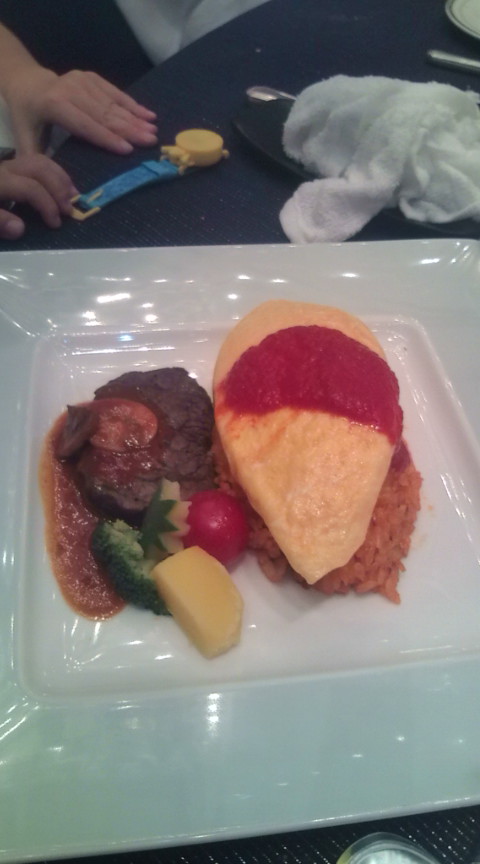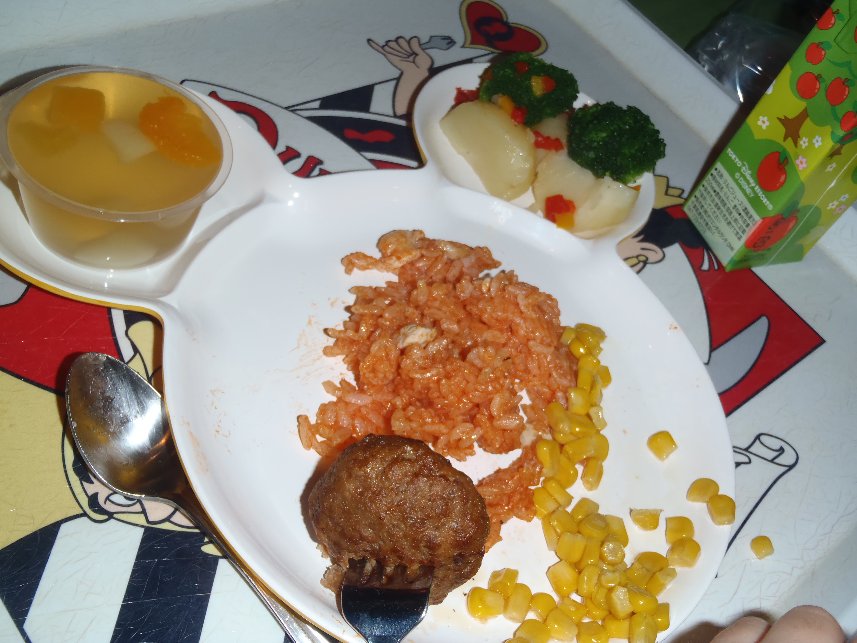 昨日の続きです。このレストランは、ポリネシアンレストランで南国風のショーのところ。子供三人見やすい位置に座らせて、大人は出ていた前菜を食べ、子供たちはサラダを食べ、(バルサミコ酢とオリーブオイルのドレッシング)、飲み物は飲み放題なので何度もコーヒーをおかわりし早速ショーが始まりました。ミッキーやミニー、チップとデールが出てきて踊りを踊り、お休みの間にメイン料理。私は相変わらず胃がいまいちで、前菜で結構きてたんだけど、(笑)メインは油たっぷりの大きな豚肉で、うってなった感じ(笑)子供たちはケチャップライスに、ハンバーグ、ジャガイモ、ホタテ、にんじん、ブロッコリー、メカジキで美味しい美味しいとバクバクあっという間にみかんは完食♪ぶどう君はね、ミッキーを見せてあげたい気もしたけどなんとご飯、子供も2700円もしたので!(笑)頼まなかったんですよね(笑)だから起こさずそっとしときました(^^;メインが終わるころまたショーが始まり、今度はお子さん方どうぞ前で一緒に踊りましょう、とのことで二人は大喜びで舞台へ。ヒナ君はね、、、最初からまったく興味がなさそうで(笑)、あくびしたりして、、、、舞台も出ず。さっきから飛行機は気に入ってくれたけど、うちの子と違って怖くないからね(^^;何か、、、せっかく来たのに楽しめてないかも~と申し訳ない感じでした。舞台でミッキーやチップ&デールと仲良しになってすっかり楽しかった二人は、メインの後のデザートの果物とゼリーも美味しく食べ満腹に。そうそう、みかんはパイナップルがダメで、、、伝えたらお店の人が別盛りにしますっていったんですよね。別になしでいいんだけど、、、と思いつつそれをみかんに伝え忘れてて、、、なんとみかん、口に入れて噛んじゃった!!あららあ(^^;そうそう、そういえば私はすっかり忘れてヒナ君にお土産買ってこなかったのに、三人には頂いちゃってりかちゃんのマスクと大好きな大好きなシールでお着替えのシールを頂いちゃって大興奮の二人。ショーも半分にシール遊びにそれぞれ熱中しちゃってたんですよね(笑)それがひな君があくびしちゃう原因でもあったわ(^^;そしてデザートを美味しく食べてディナーショーを後にして、じゃあ次は今まで足を踏み入れたことのないゾーン、ヒナ君は大好きなゾーンの、おばけがたくさんいるゾーンの、アトラクションへ行きました。待ってる間にぶどう君も起きたので、ひな君がさっきから渡したがっていたお土産をここで渡してもらいました。なんと!ひな君が昔使っていたトミカを大量に!かっこいいスポーツカーやたくさんの緊急車両にもちろん大興奮のぶどう君!寝起きでちょっと動きが緩慢だったけど、一つづつ出したり袋に入れたりうれしそうなのが見てわかる(笑)ヒナ君のほうも、すごいだろ!これが俺の車だよ!と(笑)自慢げでした!本当にありがとうね!そして懐中電灯でお化けを照らすアトラクションは、怖いかなあって心配だったけど、、、二人は面白かったそうで、一生懸命お化けを照らして楽しめてよかった!売店で、あの懐中電灯とヘルメットがほしいとヒナ君がうろうろしてたらうちの子たちもほしがってうろうろ(笑)そんなことよりもっとほかに乗ろうよ!と店から連れ出して、歩いていくと夜のパレードに出会った!しばしパレードを堪能し、今度はトゥーンタウンへ。入り口のアトラクションは車だよ、とヒナ君のママが言うのでみんなで入ってみると、こちらも待ちなしでがんがん進んだんだけど、アトラクションの入り口に行くまでに、、、いかにもうちの子には怖そうな、、、爆発とかする感じで、、、あらああ、、、って思ってたら、みかんが、どうしても入りたくない!今すぐここを出たい!となき始めた(^^;でも目の前に見える車にはぶどう君が乗りたくて、りんごもヒナ君も乗りたい。うーむ、どうしようってことで、りんごとヒナ君とヒナ君ママが乗り、私たちは待ち、ヒナ君ママが帰ってきたところでみかんを預け、私とぶどう君が乗ることに。乗ってみて、、、すぐに、みかん大正解!と思った!(笑)超怖いんだもん。さすがこういうのこわそうって思う能力高いよね(笑)ぶどう君は、、、やっぱり怖かったみたいで途中から椅子にへばりついてねっころがっちゃって、おわったら、こあいい、、、、って(^^;気を取り直してトゥーンタウンを先に進み、今度はミニーのおうちを楽しみ、これだけすいてたらミッキーのおうちもすいてるかも!とそちらへ並んでみることに。それが、、、並んでみたら失敗だったようで、、、延々並び、まったく進まず、、、4,50分ほとんど動かず並ぶ羽目に。。。みかんはすっかりヒナ君と仲良くなってヒナ君のお気に入りのクレヨンしんちゃんが楽しいらしくぶりぶり!ぶりぶり!とかいって(笑)遊んでましたが(笑)、自由人りんごは眠いと思ったら眠いらしく眠くなったらかゆくなったようで、かゆい!眠い!とぐだぐだ。でもなあー、ここまで並んだのに、