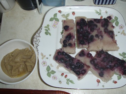 重曹少々を混ぜて、オーブンに入れる直前にりんご酢少々と、冷凍ブルーベリーを