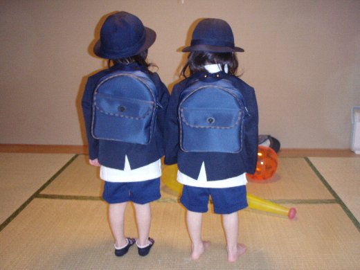 帰宅後は幼稚園の一式を着て、荷物をそろえて大喜びの2人。