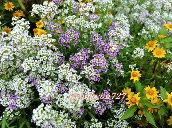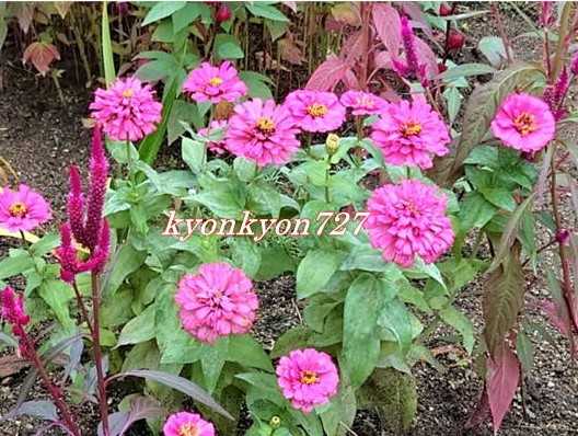 濃いピンクのヒャクニチソウ(かな?)と赤いケイトウもなかよく。