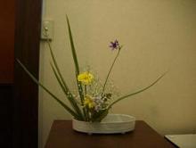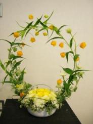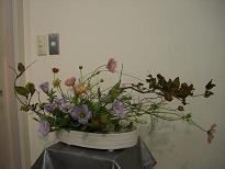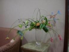 10月からステップアップしてのレッスン先生も変わり、少々緊張してのお稽古。でも、私のお稽古一番最初に教えて頂いた先生なので、私にとってはラッキーなスタート。でも、今日のお稽古は、いつもなら土台となるオアシス等の花止めがあるのに・・・今日はない為に、花材が落ち着いてくれない。花の向き、曲がりによって、向いてほしい方向に向いてくれない。こっちを向いて、落ち着いてほしいのに、花の重みによってとんでももない方向を向いてしまう今日のお稽古は、本当に四苦八苦しました。お稽古の前に、前のステップから一緒の20代前半の彼女やってくるなり、「もう私最悪なんです・・・」って少々ブルー聞いてみると「失恋」したんです・・・と言っても、彼のほうが今まで、彼女に好意を示していたようなのに、彼女がその事に気づかずに、彼に彼女ができてからようやく、ジェラシーを覚えて自分の気持ちに気づいたよう。「でも、今から自分に正直に気持ちを伝えてみます!!」と前向きな彼女・・・若いっていいなあ~!!来週、会った時には進展しているかな?いいように進展していると、いいんだけれど。★10月4日のお稽古★♠ ♠ ♠ ♠ ウエルカムフラワー♠ ♠ ♠ ♠ ウエルカムフラワー♠ ♠ ♠ ♠ 鏡前♠ ♠ ♠ ♠ ★投げ入れ★