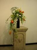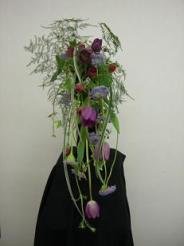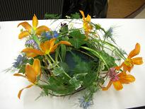 本日のオレンジの花何だと思います?皆さんのよ~く御存知の花です・・・そう、チューリップ(バレリーナ)私は教室に行って、この花を見た時はチューリップって思わなく変わった色の百合だな?!なんて思っていました。それが、百合ではなく教室の暖かさの為チューリップが全開してしまった為、見慣れたチューリップの形式から、程遠くなってしまったようです。寒い部屋に置いてやると、いつものスマートなバレリーナの形に戻ってくれました。アカヅルでベースを作って、絡ませながらアレンジしていくのはいつもと雰囲気が違ってとっても楽しかったです。今日の花材料 チューリーップ(バレリーナ) ニゲラ、ポンポンスカビオサ、ニゲラ ガラックス、アイビー、アスパラガスベラ、アカヅルナチュラルスタイル 絡まる