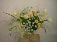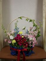 バスケット 今回のレッスンは、予算6000円で目的、誰に渡すものか、デザインを考えて作成しプレゼンテーションするというものでした。私は、目的がなかなか決まらず、出遅れてしまった為ほしい花が、数少なくなり思うようなデザインではなくなったが、まあ、なんとかできあがりました。私は、何十年と会っていない学生時代の友人宅を訪問する時の手土産を考えました。