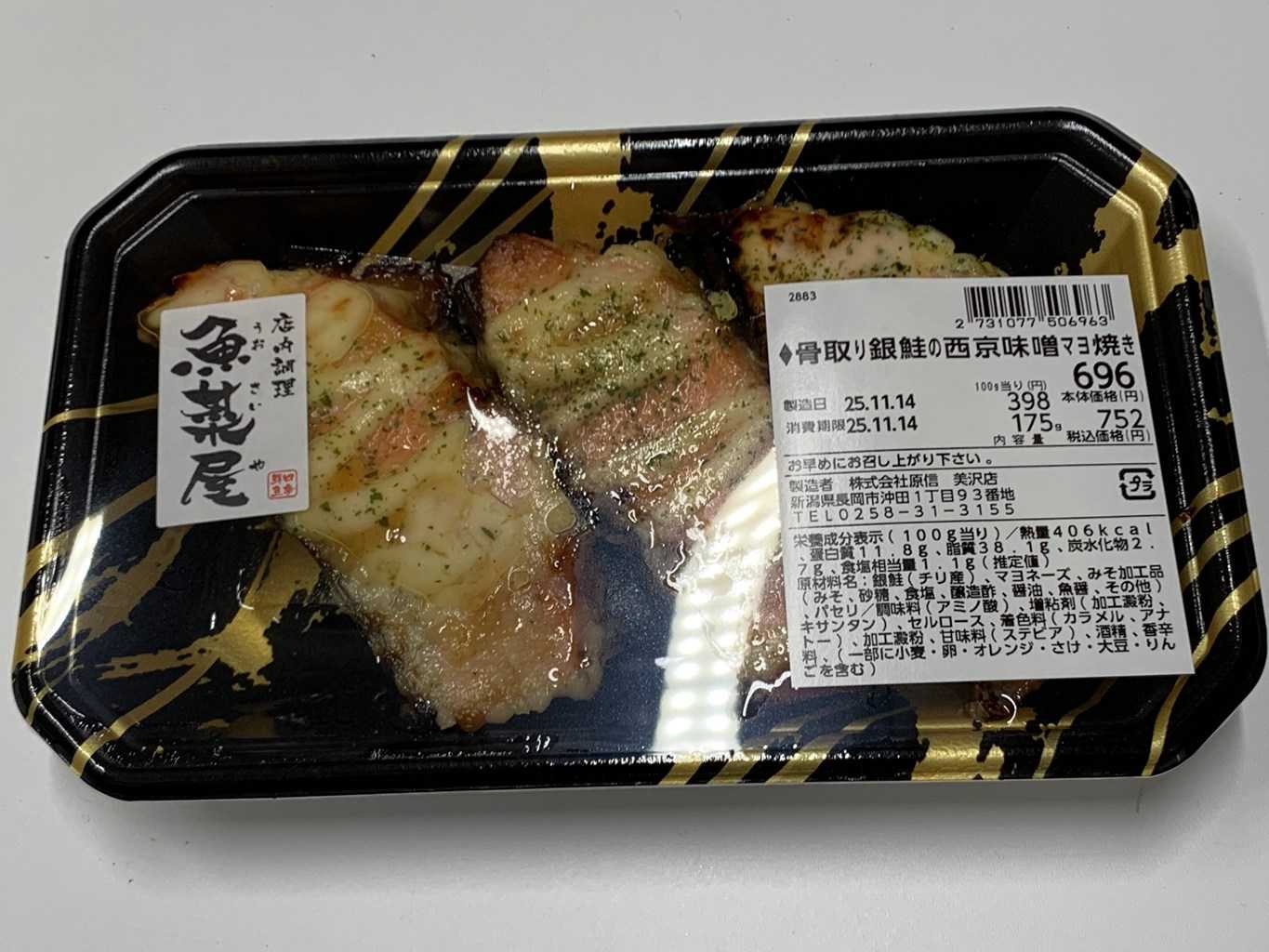 商品研究 「原信 美沢店」の「骨取り銀鮭味噌マヨ焼き」本体価格100gあたり398円、Pたあたり696円を試食「原信 美沢店」の「骨取り銀鮭味噌マヨ焼き」本体価格100gあたり398円、Pたあたり696円を試食マヨネーズと味噌の相性は良いですね。