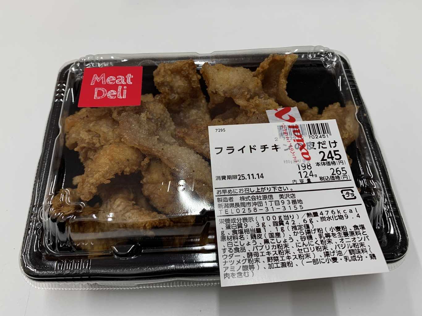 商品研究 「原信 美沢店」の「フライドチキンの皮だけ」本体価格100gあたり198円、Pあたり245円を試食「原信 美沢店」の「フライドチキンの皮だけ」本体価格100gあたり198円、Pあたり245円を試食します。最近、焼鳥や唐揚げ店のお持ち帰り店でみかけるアイテムですが、こちらは揚げ色が白いので見た目がグロいですね。100gあたり198円って結構高いように思いますが、カリカリのテクスチャ家ではできないですからね。