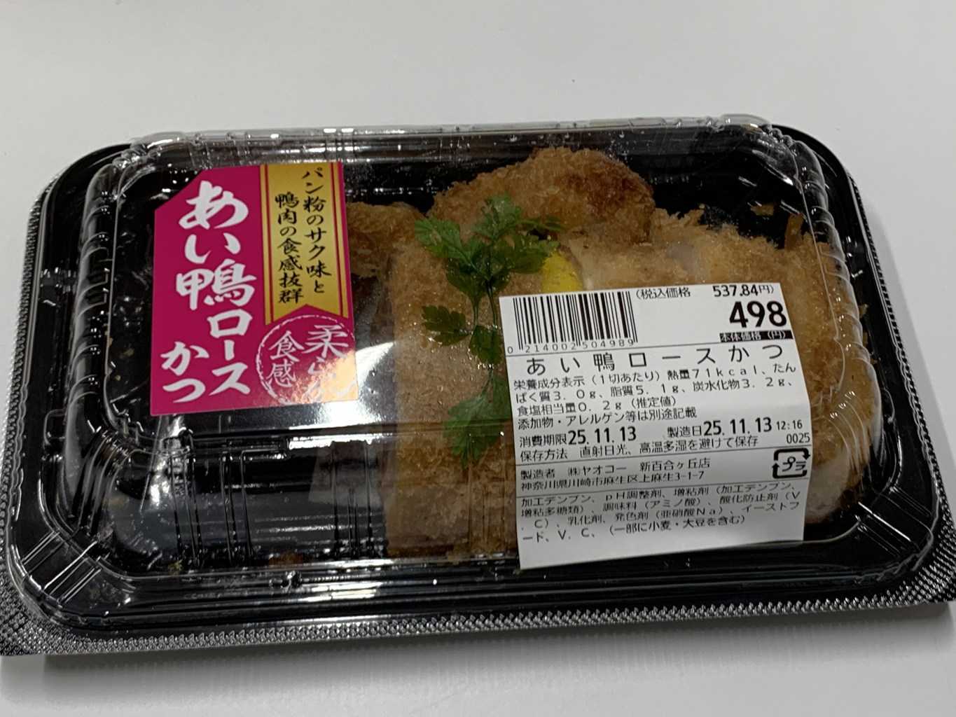 商品研究 「ヤオコー」の「あい鴨ロースかつ」本体価格498円が平台に陳列されていたので、購入して試食千葉に住むパートナーの齋藤さんから話に聞いていた「ヤオコー」の「あい鴨ロースかつ」本体価格498円が平台に陳列されていたので、購入して試食します。もっと鴨ぽい臭みがあるかと想像していたのですが、まったくそういう感じじゃないですね。身厚な鴨はふわふわ。サクサク、ふわふわ。これはさすが「ヤオコー」という感じですね。