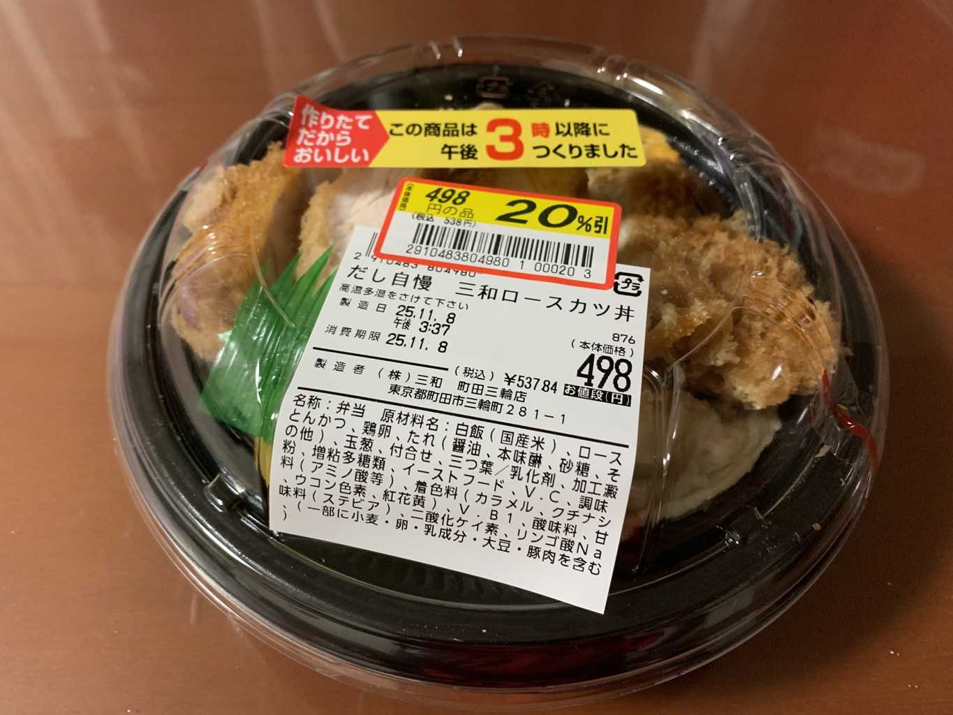 商品研究 定点観測で「スーパー三和」の「だし自慢 三和ロースカツ丼」本体価格498円を20%引きで購入して試食 今日は定点観測で「スーパー三和」の「だし自慢 三和ロースカツ丼」本体価格498円を20%引きで購入して試食します。パック込みで400gですね。私が現場にいたころを思い出すと、ライス250gロース100g+丼タレ、玉子だったので、だいたい同じくらいかな。なのでボリューム満点です。スーパー三和の堀之内店や稲城店にお店を出店していましたので、カツ丼を見るとお世話になった山口部長を思い出します。