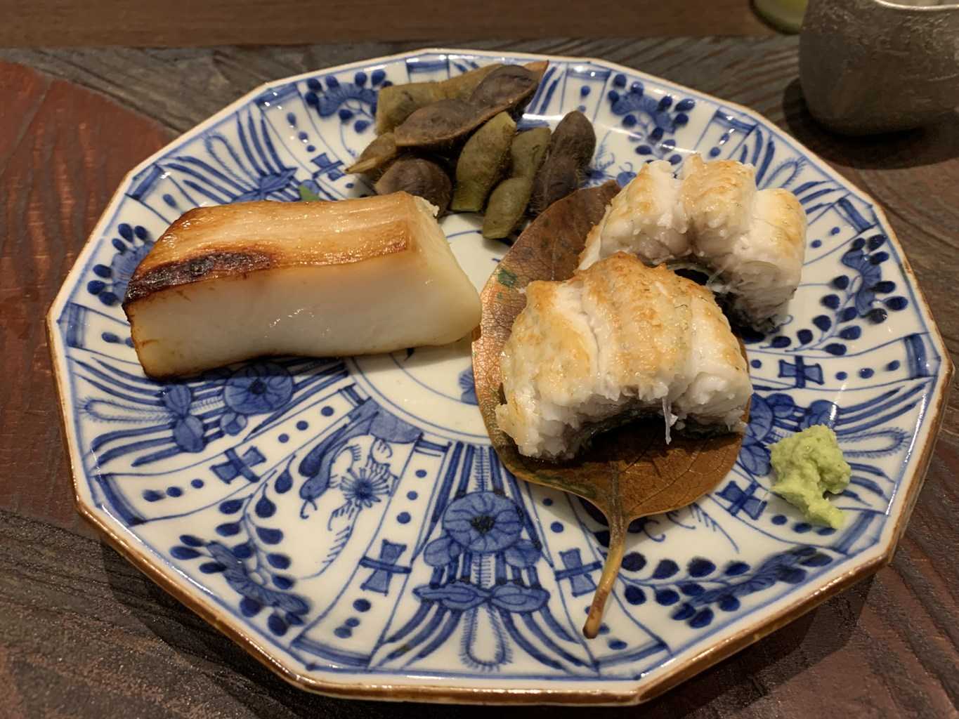 素材研究 「う越貞」の真魚鰹の味噌漬け、有明の海鰻の焼き物二種 過去の勉強禄より「う越貞」の真魚鰹の味噌漬け、有明の海鰻の焼き物二種 一緒に丹波黒枝豆間人の真魚鰹間人なんてめずらしいですね。八代の天然海鰻