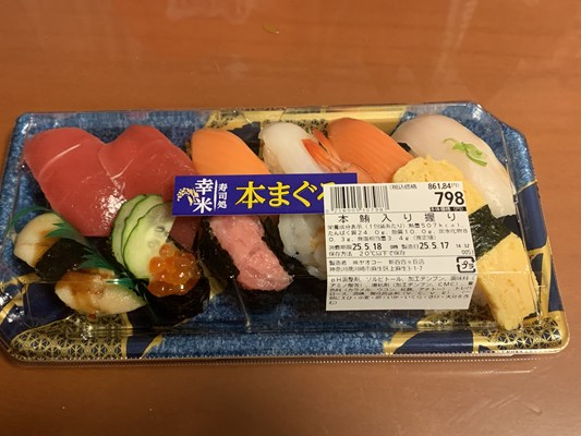 商品研究 「ヤオコー」の惣菜売場の「本鮪入り握り」本体価格798円を試食「ヤオコー」の惣菜売場の「本鮪入り握り」本体価格798円を試食します。鮪2カン、サーモン2カン、サーモン挟んで烏賊、白身、煮穴子、ねぎとろ、細く切った烏賊、赤海老、玉子ですね。白身の魚種はなんだったのでしょう。コスパはいいですね。今日はそれぞれのパーツを調べてみましょう。鮪は28gシャリは18gくらいに設定しているのでしょう白身。烏賊もう一カンの鮪も見てみましょう。