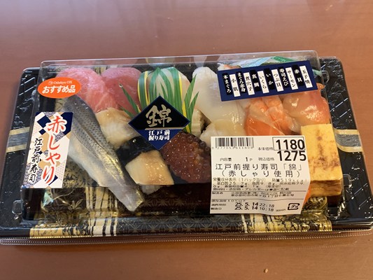 商品研究 「小田急OX」の「江戸前握り寿司 「錦」(赤しゃり使用)」本体価格1,180円を試食「小田急OX」の「江戸前握り寿司 「錦」(赤しゃり使用)」本体価格1,180円を試食します。本まぐろ中トロ、まぐろ赤身、真鯛(やわらかい)、いか(こりこり)、海老、赤貝小鰭(パサパサ系)、煮穴子、いくら(鱒)、つぶ貝シャリシャリ、サーモン、玉子焼き赤酢使用ですっぱいというより味のあるシャリという印象です。以前なら980円で販売していたような印象で、米とネタの仕入れ高騰でか、だいたい売価は200円くらいアップしていますね。980円は8カンの握りで、本体価格1,580円のものもありましたね。