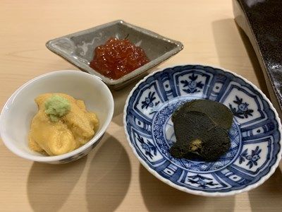 天草の生雲丹、鱒の子の味噌漬け、鮑の肝の粕漬け