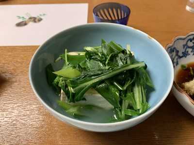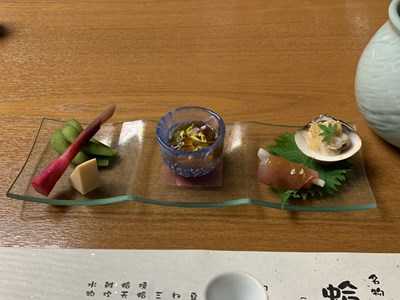 とびこをのせた蛤、魚の生ハムと玉葱、蓴菜豆腐、枝豆、はじかみなど