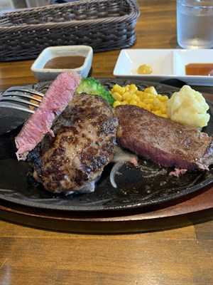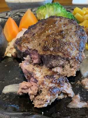 和牛ハンバーグは上田伸也さんが小代の売店で出しているようなスライスをまとめたような感じですが、細かく挽いた挽き肉が入っているのでしょう、うまくまとまっていて、ナイフを入れた時にぼろぼろと崩れないですね。
