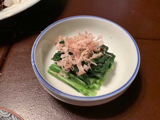 それと小柱のぬた、胡瓜の古漬け、大根の葉のぬか漬け、ほうれん草のお浸し、里芋を注文します。