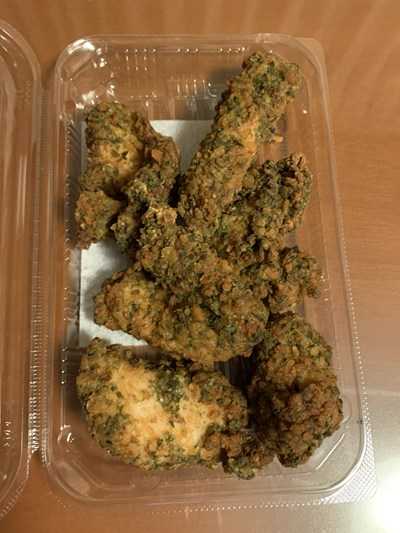 「ヤオコー」の「21世紀の海苔塩からあげL」本体価格100gあたり218円、Pあたり466円を試食します。