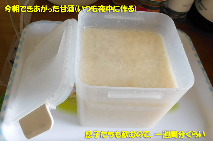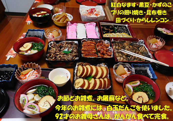 年末の27日・28日に、合わせて5万円ちかくの買い物をしていたので、その後はずっと買い物に行かなかった。まだ、食材は残っているのだけれど、運動不足のような気がしたので、今日はリュック背中に、近くのスーパーまで行ってきました。庭にも出ていなかったので、久しぶり。すると、絞りの椿が咲いていましたし、胡蝶侘助も咲いていました。そうそう、ブログ友のにととらさんが、千両と万両のことを書かれていましたので、我が家の万両をパチリ。生垣のあちこちに万両が植えてあるのですが、これはそのうち、白玉椿の根元の分。別の場所のは、紅白両方の実がなります。手前にちらっと写っている「シモツケ」の紅葉がきれいですね。話変わって、こんなのも、手作りに入るのかしら。ホットケーキに入れたり、これ単独でつまんだり。私の好物のひとつです。できたレーズンを取り出したあとのラム酒は、まだ使えそうだったので、次のレーズンを追加しました。これで、4回目です。では、朝ごはんシリーズ。まずは、昨日の朝ごはんなんせ、買い物に行っていないから、冷蔵庫にあるものや乾物で作っています。そして、今日の朝ごはんゆでたパスタ麺に具をのせて出したこともあるのですが、息子たちが「最初からまざってるのがいい」と言うので、たいていこんな雰囲気になります。入れる具は、その時にあるもの。美味しかったですよ。