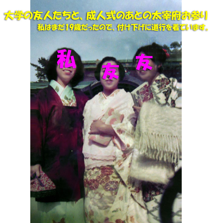 昔、私がまだ学生だった頃、成人式は、満20歳になっている人を祝う行事でした。だから、友達のほとんどが成人式に出るとき、私には案内が来ませんでした。誕生日が3月だったから・・・でも、みんなが振袖を着て太宰府天満宮にお参りに行く、というので、私も着物を着ていくことにしました。ただし、振袖は、20歳になってから、ということで、作ってもらったのは付け下げ。外は寒いかもしれないので、みんなはショールを使うけど、私は道行コート。とてもきれいな色で、模様もきれいなお花でした。でもね、やっぱり振袖には負けています。この付け下げは、娘が19歳のときに、いきなり「着物着て、太宰府に行ってくる」というので、母が着せてくれたときの写真が残っています。その後、着ないままタンスに入っています。で、いよいよ20歳になったときには、振袖を作ってもらいました。そして、福岡市から成人式の案内のハガキも来たけれど、どうせ知らない人ばかりだから、行かないことにしました。友達はみんな前の年に終わっていますからね。というわけで、両親と一緒に太宰府天満宮へ。両方ともぼけていますね。この着物は、私の一番の晴れ着ですから、その後、結婚式にはたいてい着ていきましたよ。割と親しくしている従姉の娘が成人式に出るときにも、「せっかくあるけん、使い~。もったいないけんね」といって、貸しましたし、うちの娘が成人式のときにも、着せました。あ、小物だけは、新しいのを買いましたけどね。せっかくだから、西鉄電車の大橋駅近くの写真館に行って、記念写真も撮ってもらいました。これは、その写真を使って、シールを作ったときのもの。一番下の息子も、昨日で27歳になったのですが、三人の子供は、誰も結婚していないので、孫がいません。孫娘でもいたら、またこの振袖を着せるんだけどなぁ。では、今日の朝ごはんピーマンは、生でも美味しいですね。そうそう、残り布で、テーブルマットを作りました。そのマットの上で、レース編み。さっき出来上がりました。さて、糊付けをしてから、アイロン仕上げをしなくっちゃ!!