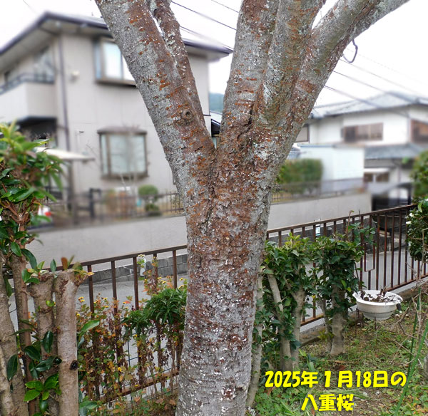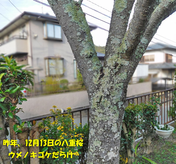 今日は、久しぶりに、 八重桜のウメノキゴケはがし