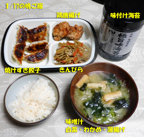 昨日は、ちょっと焼き色が付きすぎた 餃子ときんぴら、冷凍の唐揚げ、味噌汁。