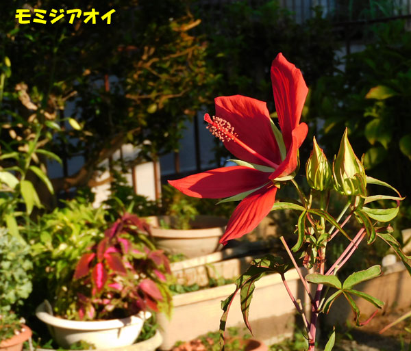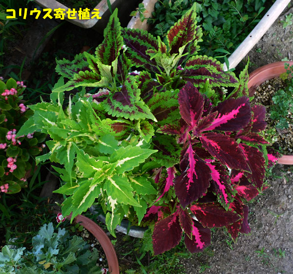 この八重桜の木陰で育っているのは、 コリウスの寄せ植え