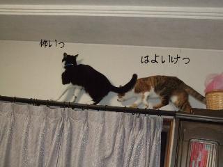 本棚からカーテンレールに登って探検中のカト&キク カト : おねえちゃん ついてきてニャキク: しょうがないニャ~ 突然真ん中あたりで立ち往生するカトちゃん 怖くなって後ずさりするカトちゃんのおケツがキクちゃんの顔面にっ カト : すごく怖かったニャ~ キク: アタシを落とす気かぁ~~~