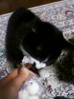オヤツにクッキーを食べていたらカトちゃんが袋ごと持って行こうとするので引っ張り合いに