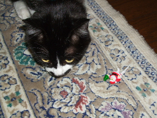 どこから引っ張り出してきたのか? カトちゃんがクリスマスケーキについていたサンタさんのケーキピックで遊んでいます。
