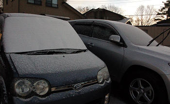 一昨日あたりは日差しが柔らかくて 春の日差しみたいね♪ なんて言ってたら 昨日から急に冷え込んで 朝、うっすら雪が積もってた。 2011.1.6 朝8時 今朝は 更に冷え込んで もっと 積もってた 2011.1.7 朝8時 でも、雪や霜対策の 「フロントシェード」をつけてるから さっと外して、雪をパッパと振り落とし、クルクルってまいてオワリ。 思ったより簡単な便利グッズでした 朝、8時過ぎに家を出ますが 団地内は 関係者以外通らないから まだ3台しか通っていないようです 全国的に冷え込んでいるのでしょうか。 皆様、暖かくお過ごしくださいね。