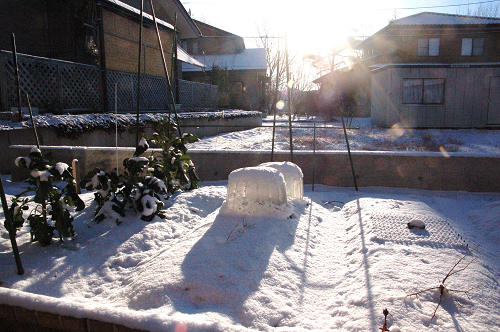 昨日は大寒だったそうですね。 寒い寒い一日でした。 日陰の道路は雪が凍っているから 歩く時には、用心、用心。 訪問しているお年寄りは 滑って転んじゃ大変だから 外に出ないんだよ・・ って、人が殆ど。 雪が融けないと 運動不足になっちゃうな。 菜園のちっちゃなドームはまるで、雪ウサギみたい。久しぶりに中を覗いてみたら随分色づいてました。苗を買ってきた時の日記随分、小粒ですけどね。たった一粒だけだからメイ君と一緒に食べようと思います