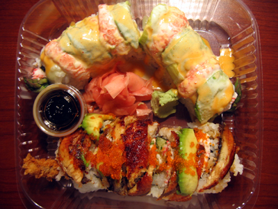 この前の日記で、ちょっと遠出 に行きました、って書いたじゃない? ・・その 添付 って感じかな、この日記は。予定ではね、前に行った事のある ここ↓ http://www.buckhornsteakhouse.com/item.asp?id=2から、『あなた達の結婚記念日のために: Dinner2人分オーダーしたら、$10引きのプレゼント!』 って手紙もらってたから、ここに行くはずだったんだけど、ここ、宿泊所から、もっと北の方で、結構遠くて、あまり時間も無かったし、行かない事にして、そのかわりに、近間の評判のいいところで食事をすることになって、その一つが、『創作寿司・テイクアウト屋さん』 で、と、こんな感じ。写真では大きさはわからないね。 巻きの直径は約5~6cmくらい。 結構デカくて、カロリー・うっひょ~ ))~Q~(( ・・ 考えない方が身のためね、ってような。 ( ̄_ ̄|||) ウームちなみに上のは、裏巻きの中に、確か、アスパラガス、エビ、きゅうり、だったかな。 上にのってるのは、エビ、アボカド、で、なんかクリィミィなソースがかかってて、ちょっとだけスパイシーだったかな。 その名も 『セクシー』。( ̄. ̄?) エ?もう、私が、その名前に イチコロ されちゃって、思わず頼んでしまったの。(;^_^A ハハハ・・・味は、別に、「セクシーな感じがした」 とかじゃーなかったけどさ。 ただ、私の傾向として、『セックス・オン・ザ・ビーチ』 とかいう飲み物があると、必ず試してみるから。(σ・。・)σ(笑) 『憧れ』が強いのね、きっと。 ┐('~`;)┌で、私が クリィミィ な感じのを頼んだから、Rg夫には クリィミィじゃないのを選ぶように言ったら、彼が頼んだのが、下ので、『ノース・テキサス』→ 北テキサス。裏巻き中は、エビの天ぷら、うなぎ、あとは忘れたね。 外は、うなぎ、アボカド、トビコだかマサゴだか。 なぜにこれが 『北テキサス』 になるのか。 ・゜・。。・( ̄. ̄ ?) ・゜・。。・こーゆー事、あまり詳しく考えちゃ ダメ ね。 ここは アメリカ だし、ね。それは 時間の無駄遣い ね。 d( ̄o ̄)ソウソウ。そんなこんなな北西の方だったんだけど、今はサンフランシスコから南の方で、今居るインターネットカフェ屋さんの、私の角テーブルの角には、こーんなテーブル・ランプがあります。ゴチャゴチャとした、なんだかすっごい存在感のあるテーブル・ランプでしょ。(笑) 今まで何回かこのカフェ屋さんは来たときあったんだけど、この角席に座ったとき無かったから全然気づかなかったよ。そんなこんなです。