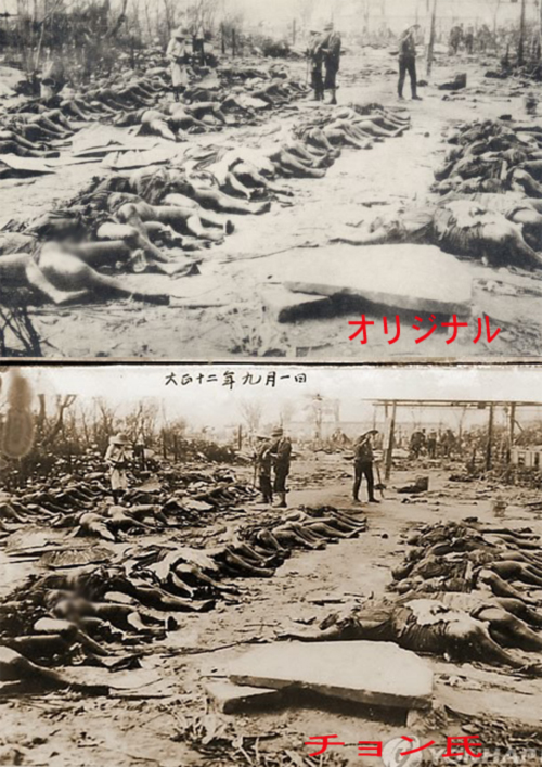 (-_-) 騒ぎ立てているのはNAVER/ソウル=聯合ニュースというところ。【韓国】関東大震災の朝鮮人虐殺推定写真を公開http://awabi.2ch.net/test/read.cgi/news4plus/1359859721/-100≪記録写真研究者である啓明(ケミョン)大学校・東山(トンサン)医療院のチョン・ソンギル名誉博物館長は3日、関東大震災の時に虐殺された朝鮮人犠牲者の様子を撮ったと思われる写真を聯合ニュースに公開した。写真上部には、『大正十二年九月一日』と日付がはっきりと書かれている。大正は嘉仁(よしひと)日王の年号で、大正12年9月1日は関東大震災が起きた1923年9月1日だ。嘉仁日王は 1912年(大正1年)から1926年(大正 15年)まで在位した。今回公開された写真には、悽惨だった当時の状況が生々しく写っている。ある写真の中には数十体の死体が羅列されていて、死体の下着が脱がされている。死体の横には男性たちが竹槍または鉄串だと見られる長い棒を持って立っている。チョン・ソンギル名誉博物館長は、「犬が死んでも碑石を建てるほど葬礼を重視する日本人が、自国の人であれば死んだ人の遺体から下着を脱がせただろうか」 と反問しながら、「女性の死体だけを選んで下着を脱がせ、また一度恥をかかせるのは虐殺をしのぐ蛮行の極致」と憤慨した。チョン名誉博物館長は、「竹槍、鉄串と見える長い棒を持っている男性たちは、(関東大震災当時、朝鮮人虐殺を行った)日本の自警団と推定される」と話した。また他の写真には、腐敗した死体が幾重にも重なっている場面が写っている。3~4年前に日本でこの写真を入手したチョン名誉博物館長は、「写真を見て驚愕を禁じえなかった」とし、「女性たちの下着が脱がされているなど残酷で恥辱 なことから公開を控えたが、今度日本の教科書に虐殺という表現を無くす事にしたというメディアの報道を見て、歴史を正しく知らせるために公開を決意した」 と話した。彼は、「恥かしい恥辱的な歴史だが、虐殺で犠牲になった6千人余りに至る朝鮮人の魂を我々が守らなければならない」とし、「写真などの立証資料を提示して、過去に日本人たちが起こした蛮行を躊躇せずに告発しなければならない」と強調した。先立って朝日新聞の報道によれば、東京都教育委員会は自らが発行する高校日本史の副教材、『江戸から東京へ』に記述された「関東大震災時に朝鮮人が虐殺さ れた」という文章を、来年からは「(関東大震災朝鮮人犠牲者追悼の)碑石には、“大震災の混乱のなか朝鮮人の尊い命が奪われた”と書かれている」に変更す ることにした。≫関東大震災http://ja.wikipedia.org/wiki/%E9%96%A2%E6%9D%B1%E5%A4%A7%E9%9C%87%E7%81%BD≪殺害された人数は複数の記録、報告書などから研究者の間で議論が分かれており、当時の政府(司法省)の調査では233人、吉野作造の調査では2613人 余、最も犠牲者を多く見積もる立場からは6661人(上海の大韓民国臨時政府の機関紙「独立新聞」社長の金承学の調査)と幅が見られる。内務省警保局調査 (「大正12年9月1日以後ニ於ケル警戒措置一斑」)では、朝鮮人死亡231人・重軽傷43名、中国人3人、朝鮮人と誤解され殺害された日本人59名、重 軽傷43名であった。≫(-_-) 当時の政府も231人の朝鮮人が殺された事実は認めていますので、虐殺があったのは確かです。したがって、東京都の副教材の記述は事実と異なるでしょう。≪9月2日午後11時、下江戸川橋を破壊中の朝鮮人を警備中の騎兵が射殺。9月2日午後11時、南葛飾郡でこん棒などで武装した30人の朝鮮人が砲兵第七連隊第一中隊長代理砲兵中尉高橋克己のオートバイを包囲したが中尉は脱出に成功した。≫(-_-) 一部で本当に暴動を起こしていた朝鮮人もいたようです。日頃の朝鮮人に対する不信感が相まって、過剰反応を示してしまったものと思われます。関東大震災の朝鮮人 http://ccce.web.fc2.com/sinnsai.html(-_-) このサイトの情報によると、当時首都圏にいた朝鮮人は12000人、そのうち警察が保護した数が6700人になっています。警察が保護しなければならないほど、当時の朝鮮人は危機的状況だったようです。震災による直接被害も含めると実際に1000人以上の朝鮮人が死亡した可能性は極めて高そうです。韓国記録写真研究家が関東大震災の朝鮮人虐殺写真を訴える 別の写真を使い捏造の可能性?http://uni.2ch.net/test/read.cgi/newsplus/1359884034/l50≪関東大震災時に起きた朝鮮人虐殺をめぐり韓国記録写真研究家のチョン・ソンギル氏が虐殺事件当時に撮影されたとみられる写真を公開した。写真には大量の遺体が並べられている。写真上部には「大正十二年九月一日」と書かれており、この日付は関東大震が発生した日でもある。この日付は分かりやすくするために後付けであることはわかるが、実は問題はそこではなかった。この写真そのものが関東大震災の朝鮮人虐殺はおろか、関東大震災とは無関係である可能性が浮上している。関東大震災が発生したのは写真にも記されているように大正12年(1923年)9月1日の11時58分32秒発生である。そんな当日に遺体を並べ虐