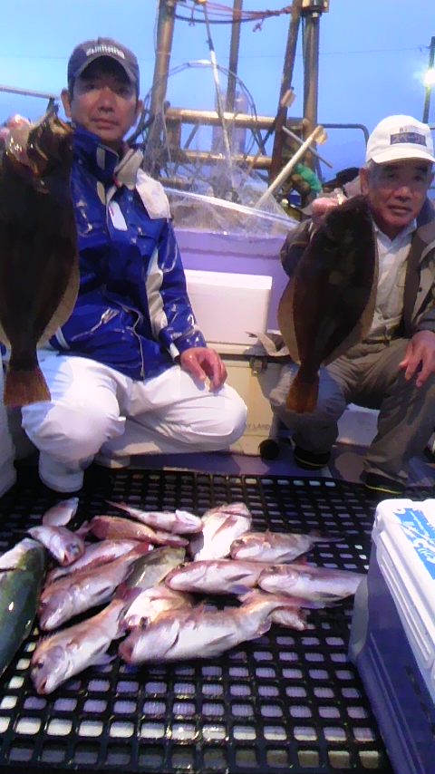 外房大原港~ ヒラメ&一つテンヤのシャクリマダイに出船しました (^^)v 10時出船 (^_^)/~ 始めはヒラメです p(^^)q 釣行時間は1時間半 (^.^)b 短い時間でしたが 大きさ0.8kg~1.3kgのヒラメを 船中6枚釣ってくれて \(^O^)/ 外道で マトウダイ イナダ も釣れました (^.^)b 次は一つテンヤのシャクリマダイです p(^^)q ポイントは大原港近く ε=┏( ・_・)┛ 釣り始めから、早々と、大きさ1kg弱のマダイをゲット (≧▼≦) その後は…………… 餌取り多く (-_-メ) 釣れるマダイはリリースサイズばかり (T_T)/~ なので 少し沖へ移動 ε=┏( ・_・)┛ 始めは餌取りばかりで (-_-メ) 釣れない (;^_^A 薄暗くなってから ☆彡☆彡☆彡 きました~ \(^O^)/ 大きさ0.6kg~0.8kgのマダイが入れ掛かり (^^)v 外道で カンパチ イナダ ヒラメ ショウサイフグ イサキ と こちらも多彩でした (≧▼≦) いい釣行になったと思います (^-^) 出船予定です ……↓……… 明日・10月19日の水曜日は ヒラメに出船いたします (^^)v 今のところ3名のお客さんから予約を頂いております m(__)m 10月22日の土曜日も ヒラメに出船いたします (≧▼≦) 今のところ2名のお客さんから予約を頂いております m(__)m 10月22日の土曜日の午後からは 一つテンヤのシャクリンクマダイに出船いたします p(^^)q 今のところ2名のお客さんから予約を頂いております m(__)m 10月29日の土曜日も ヒラメに出船いたします (^^)v おかげさまで満船となりました~\(^O^)/ ありがとうございます m(__)m 11月12日土曜日は オニカサゴに出船いたします (^^)v 今のところ4名のお客さんから予約を頂いております m(__)m 今後の釣り物予定です ………↓……… 10月からは ヒラメ解禁ですので メインでヒラメ その他 一つテンヤのシャクリマダイ オニカサゴ にも 出船いたします。 ご予約お待ちしております m(__)m 尚、ヒラメの乗り合いは12名までとさせていただいておりますので、ご了承ください m(__)m お知らせです ……↓…… 東日本大震災復興イベント第2弾 がんばろう いすみ 沖釣りウェスタ開催! 11月23日 祝日 水曜日 参加資格 中学生以上 釣り種目 ヒラメ 受付時間 4時半~5時 開会式 5時~5時20分 釣り時間 6時~11時半 料金 活エサ込み 11500円 参加賞 いすみ市内で使用できる振興券 3000円分 賞品等 後日、いすみ市の特産品が当たる抽選会を行います。 *抽選は後日、実行委員会において、厳正かつ公平に行い、当選は、発送をもって発表に代えさせていただきます。 お客さんへのお願いです m(__)m ………↓……… 勇盛丸では、常にお客さんの安全を考えて操業しております 【安全1番・楽しさ2番・最後に釣果はついてくる♪♪♪】《文明堂カステラのCMのパクリですが…(;^_^A》 をテーマに 命を預かる商売ですので、いつも慎重かつ冷静な操船を心がけております。 その為には、お客さんのご協力が必要不可欠ですので…… 生意気な言い方かもしれませんが 海の上では、マナーと船長の指示を必ず守って下さるよう、お願いいたします m(__)m