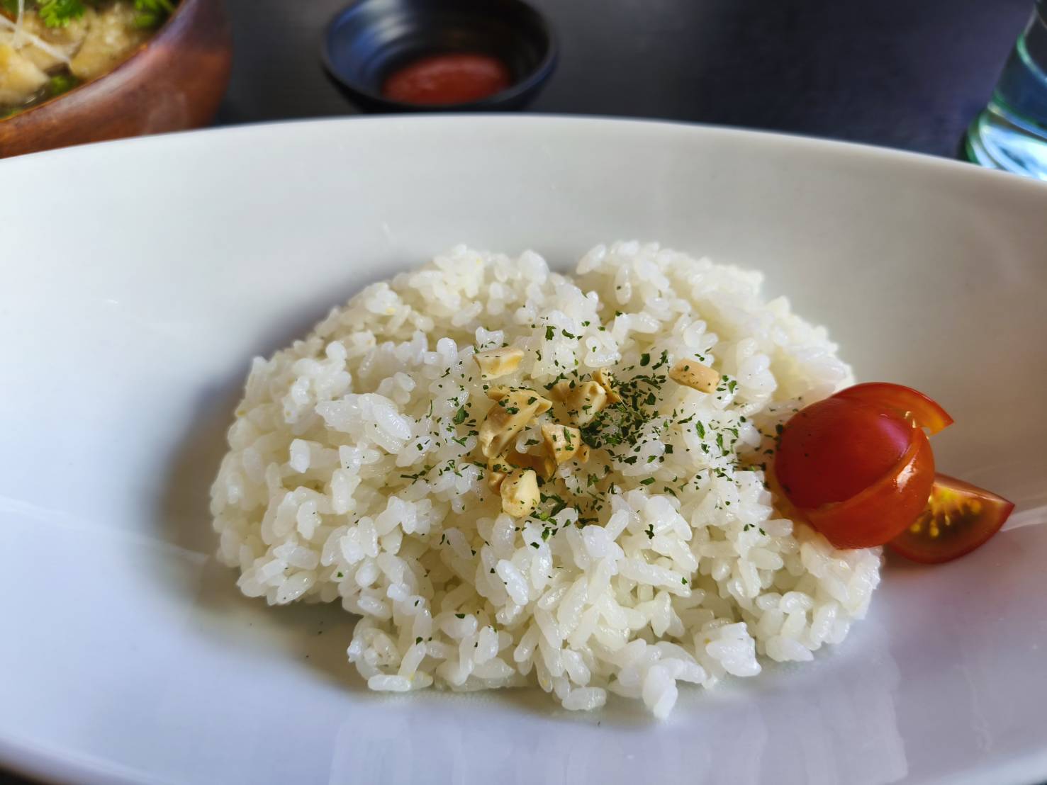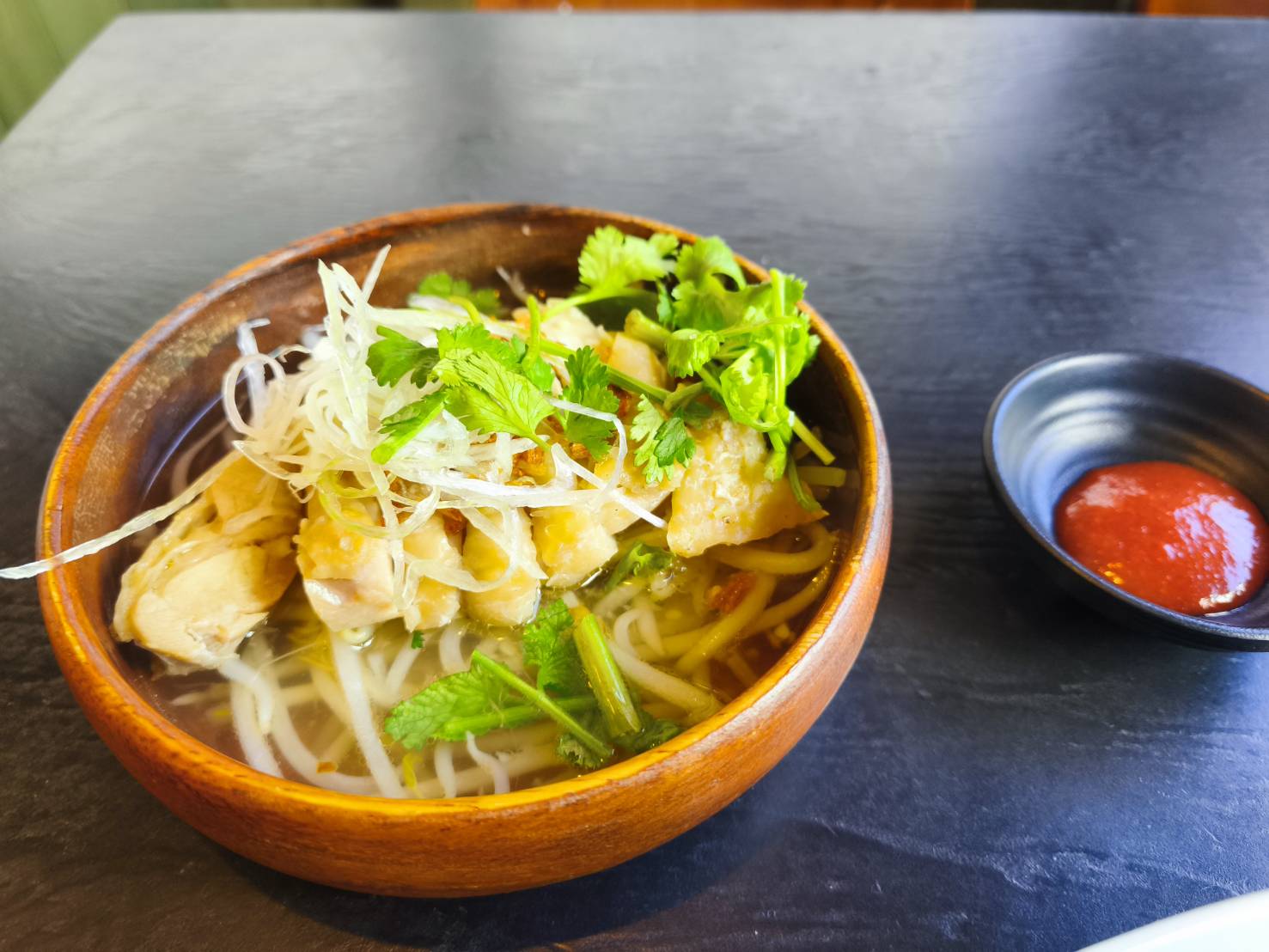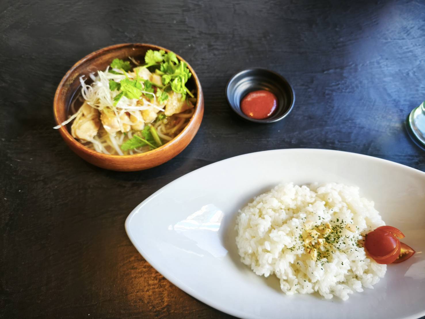 チキンスープをライスにかけて食べる。お好みでチリソースを。美味しかった。