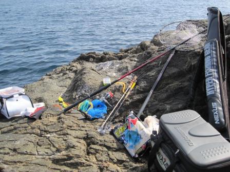 ようやく風が収まり、午後から坂浦へ:釣り友達が先にいたところへ合流しました坂浦の磯で一番小さな低い磯です。(波があると乗れません)Hクンはマダイを狙ってます。 合流。 午後1時30から5時30まで釣りましたが、本日は釣果0でーす下し潮が初め流れていたんですが、後半はぱったり潮動かず・・・・・・ 最初、1発、HIT!!しかし、一瞬で竿のされ、2号ハリスがプツリちょっと油断してました。結構重かった;:::::けど タイの気配も今年はまだありません